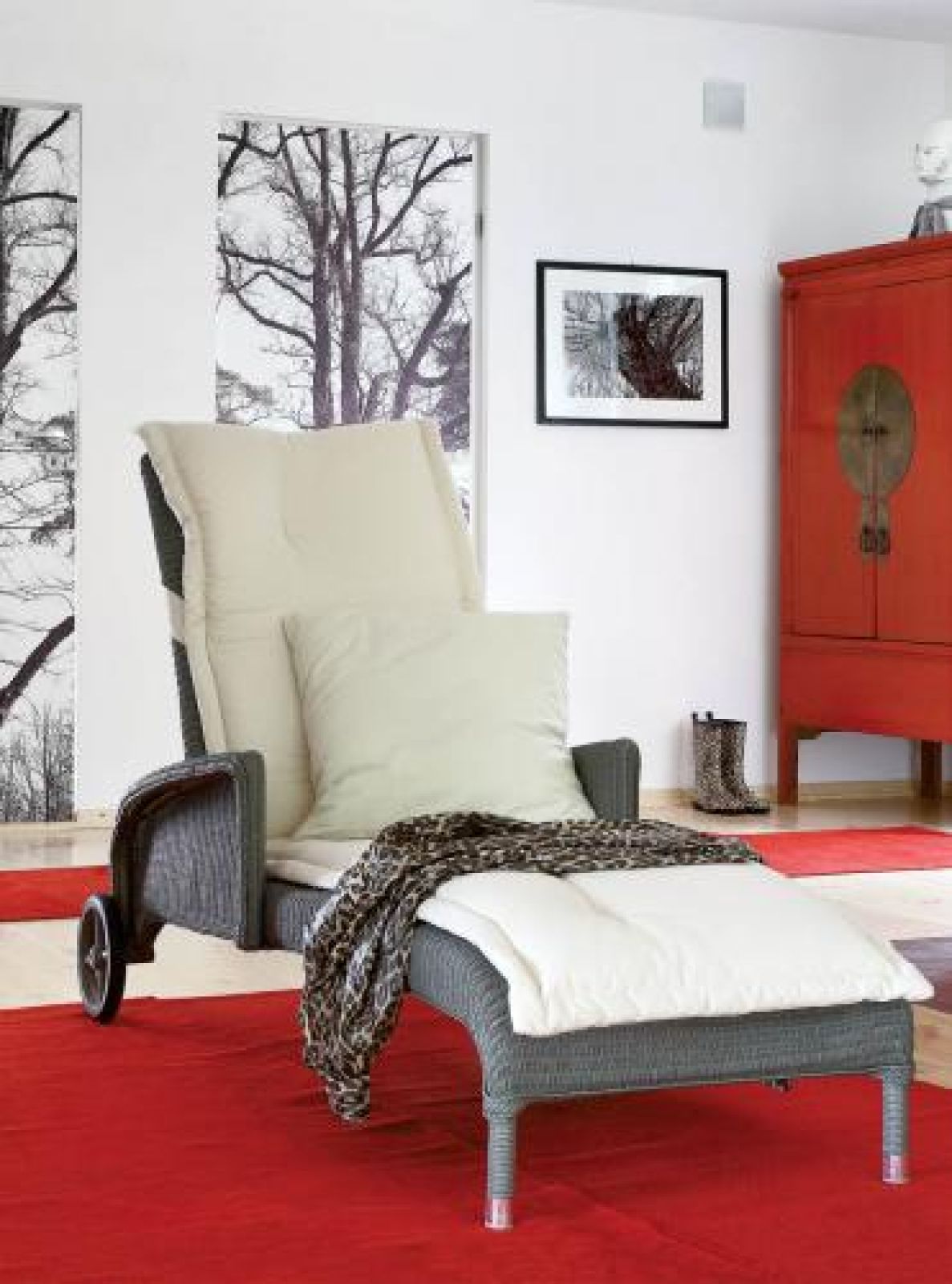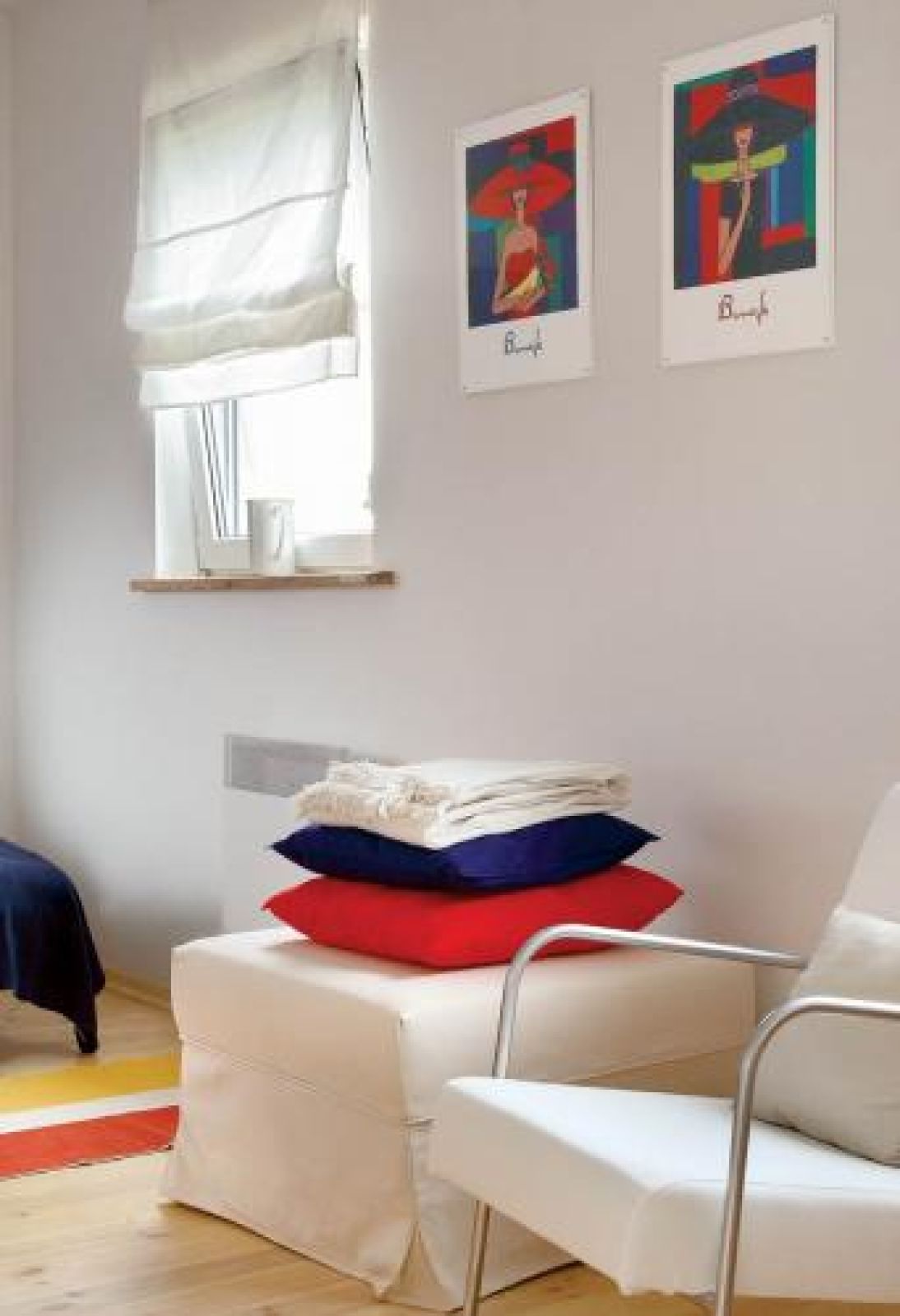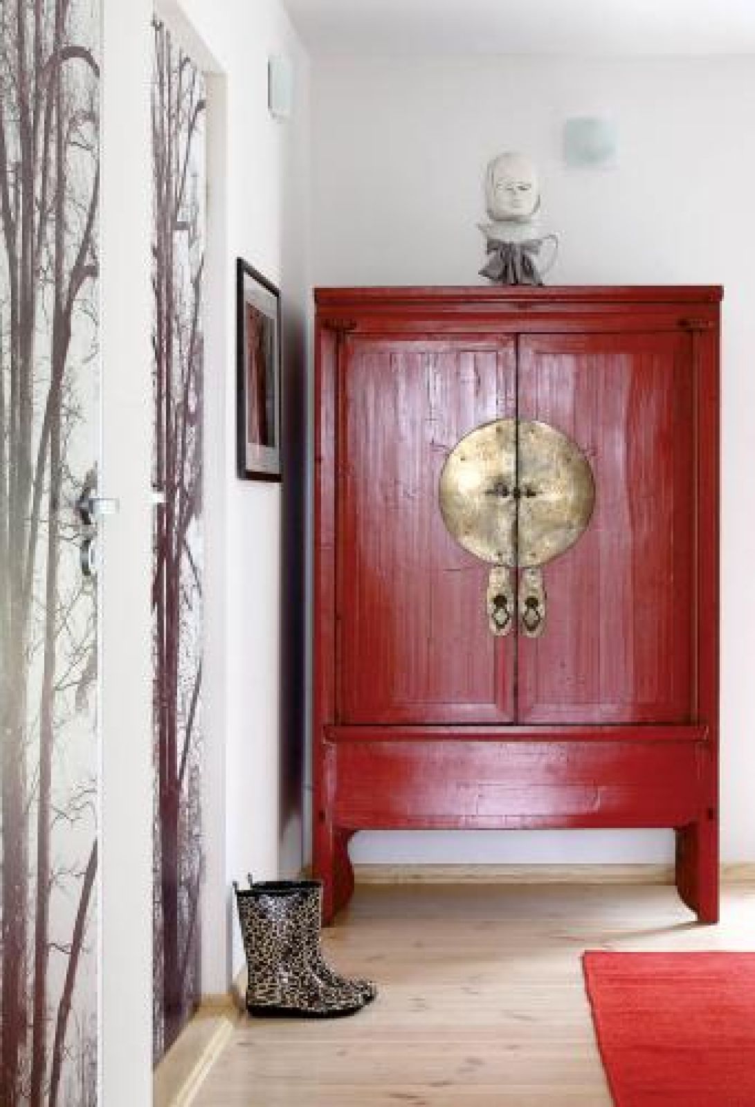 Zdobią ściany, a nawet drzwi. Pasują do grafik Wiesława Szamockiego. W sypialni gospodyni powiesiła też obraz Małgosi Malinowskiej, na który zabrakło miejsca w Warszawie. Mebli jest mało. Tylko to, co potrzebne do wygodnego życia. Przydały się praktyczne prezenty od przyjaciół, jak wykonana przez Zbyszka Szczepańskiego, rzeźbiarza i projektanta, kuchnia z drzwiczkami ze stali kwasówki czy czerwona kopia XV-wiecznej chińskiej szafy z Galerii Red Onion.