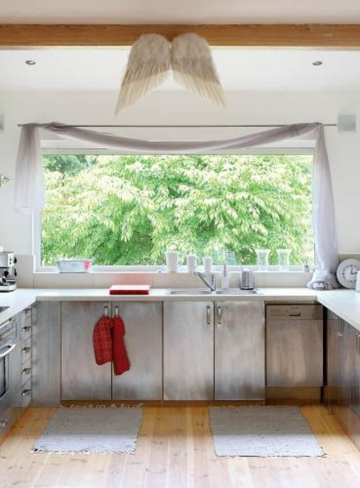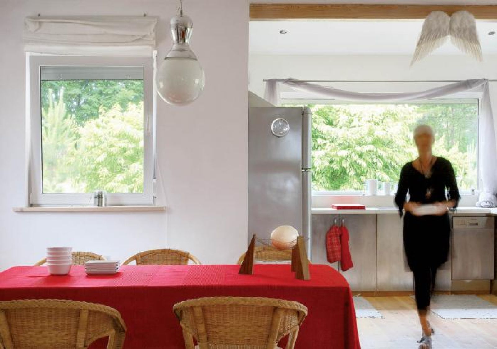 Dlatego wyjścia na tarasy są przestronne, a meble z salonu łatwo można przenieść, gdy zjawi się więcej gości. Jest funkcjonalnie, prosto i nie kosztowało to wielkiego majątku. Wiadomo, potrzeba jest matką wynalazków, dlatego z powodów finansowych trzeba było zastąpić wymarzony „designerski” stół do salonu zwykłym drewnianym stołem ogrodowym – bawełniana czerwona narzuta na łóżko świetnie udaje obrus i zakrywa niedoskonałości mebla. Warszawianka znalazła to, czego szukała – ciszę i spokój za oknem, krajobrazy jak obrazy, a anioły mają miejsce, do którego lubią zaglądać.
