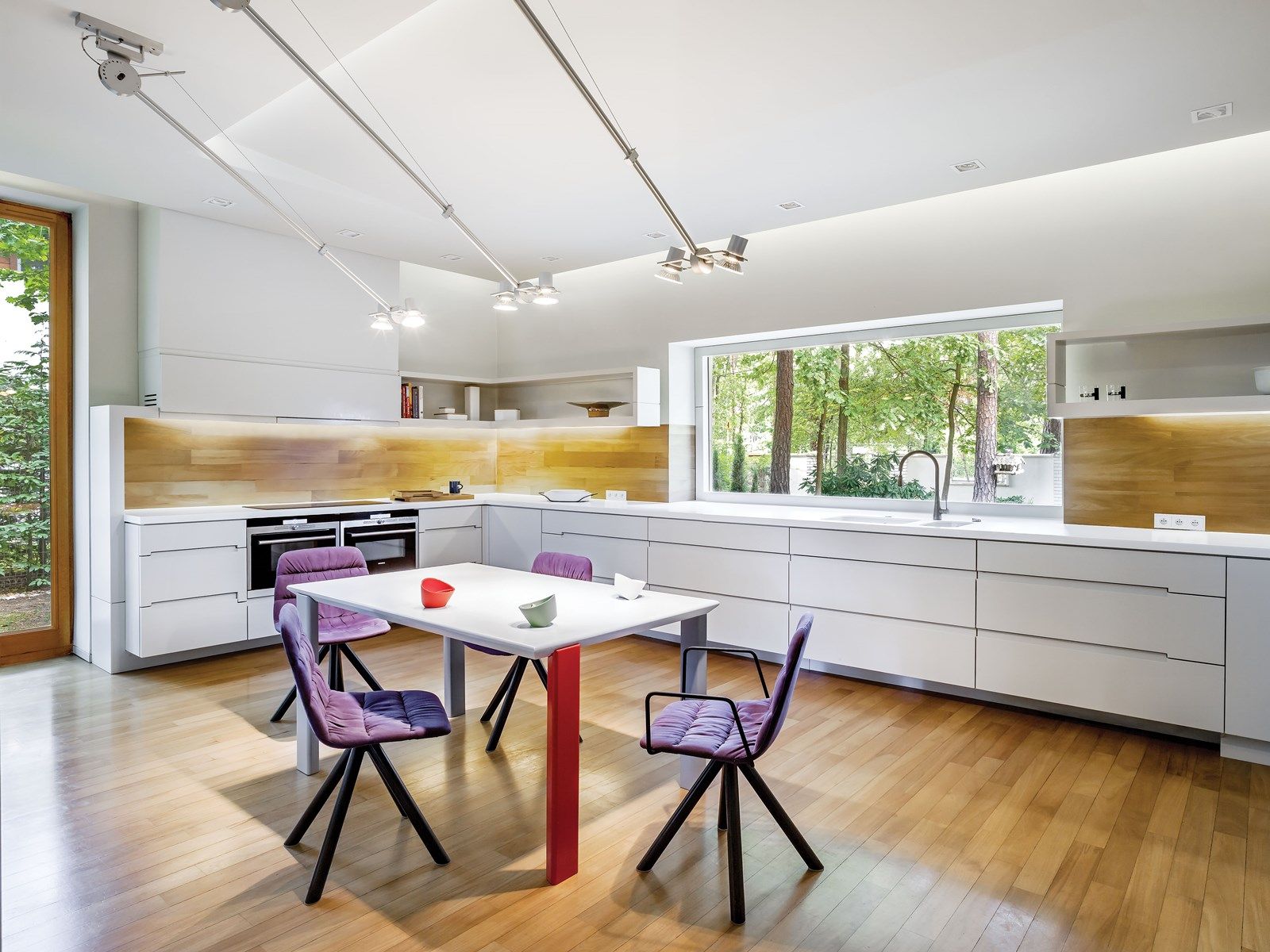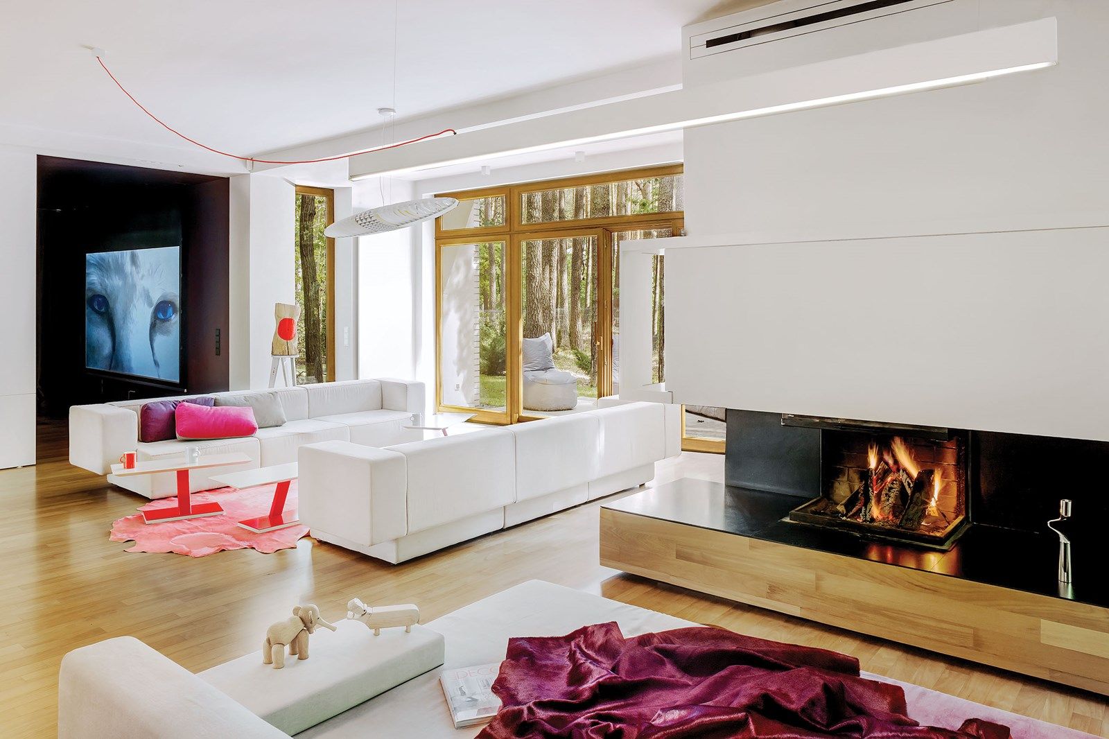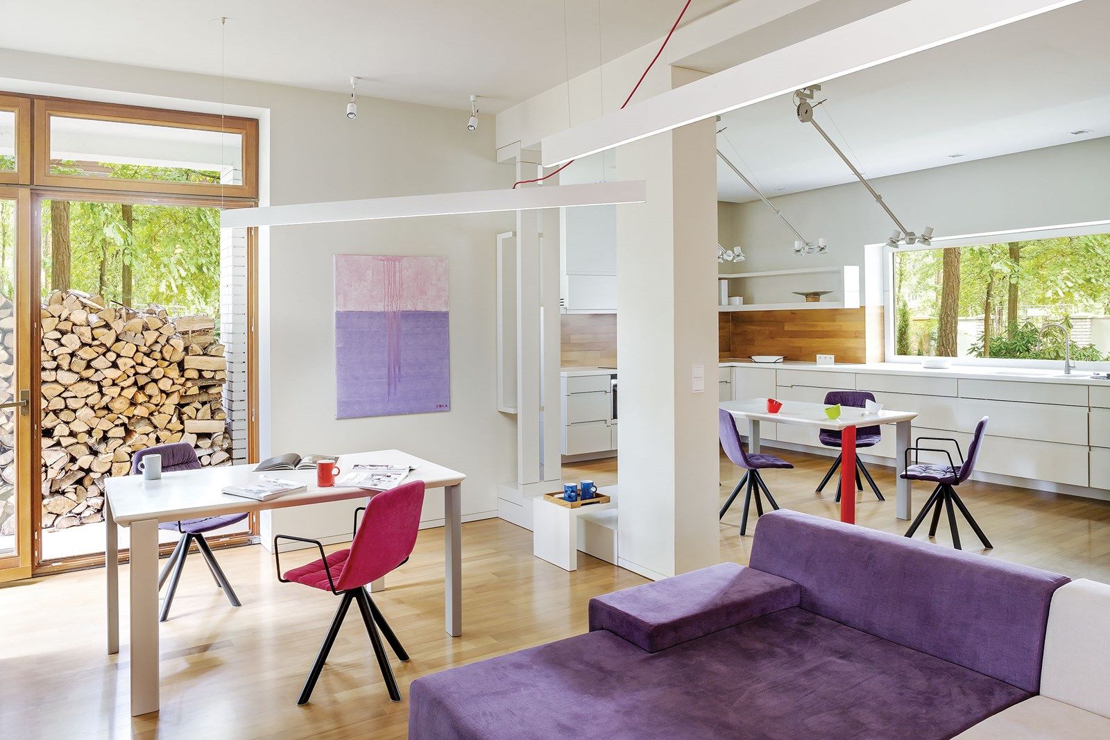 Ale wszystko było warte zachodu. Samo wnętrze tak bardzo się Emilowi podobało, że na pewien czas zrezygnował z mebli i dodatków. Chciał się cieszyć pustą przestrzenią i wpadającą przez wielkie okna zielenią. Jednak pustka zaczęła go potem trochę męczyć. Brakowało mebli i sztuki. Długo debatowali nad wyborem, w końcu Paweł podsunął mu sofy hiszpańskiej marki Viccarbe. Ich proste, geometryczne kształty pasowały do bryły domu. Co ważne też dla wyczulonego na detale miłośnika sportowych aut, były szyte grubymi czerwonymi nićmi – jak fotele w maszynach rajdowych.
