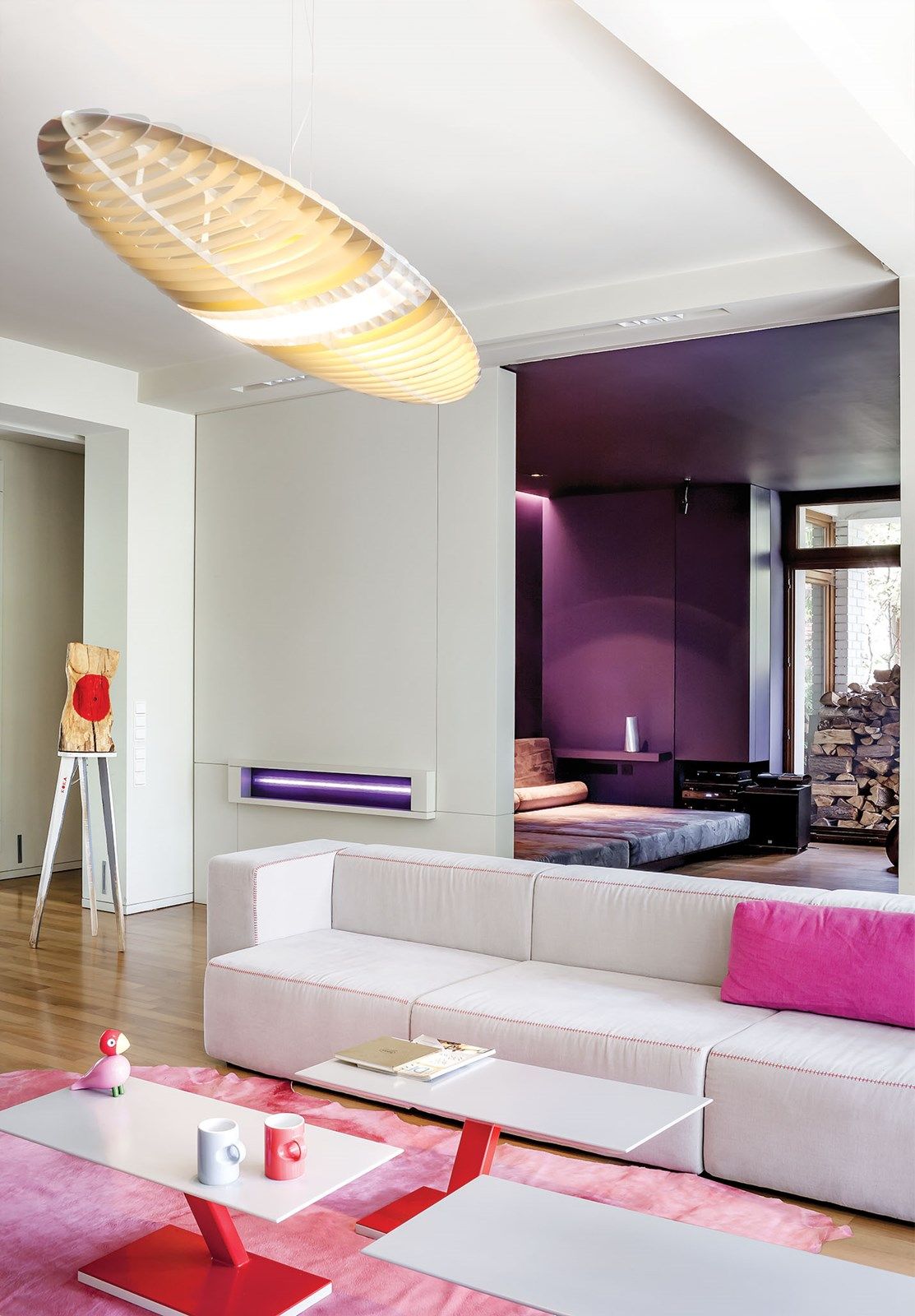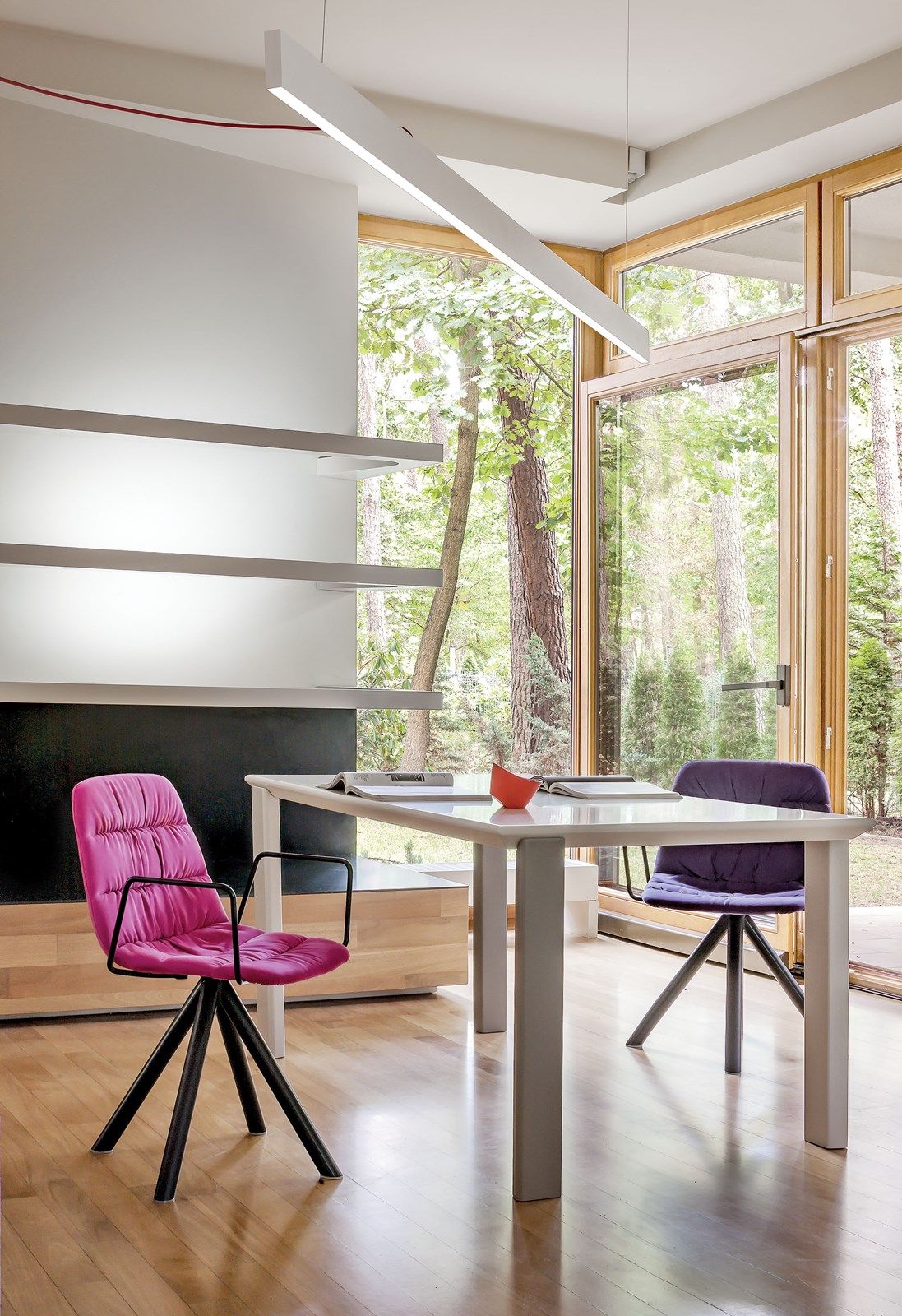 – Powstał damsko-męski miks. Bo kiedy zaczynaliśmy współpracę, Emil był singlem i mieszkał z ukochanym owczarkiem niemieckim. Dziś ma żonę i dwoje dzieci. Zestawiłem kanciaste kształty i żywe, babskie kolory, które zresztą zaproponował sam właściciel: róż, fiolet i fuksję – mówi Paweł. – Niekoniecznie damskie – śmieje się Emil. – Proszę zajrzeć do mojej garderoby – większość moich koszul jest różowa. To kolor przyjęty w środowisku finansistów.