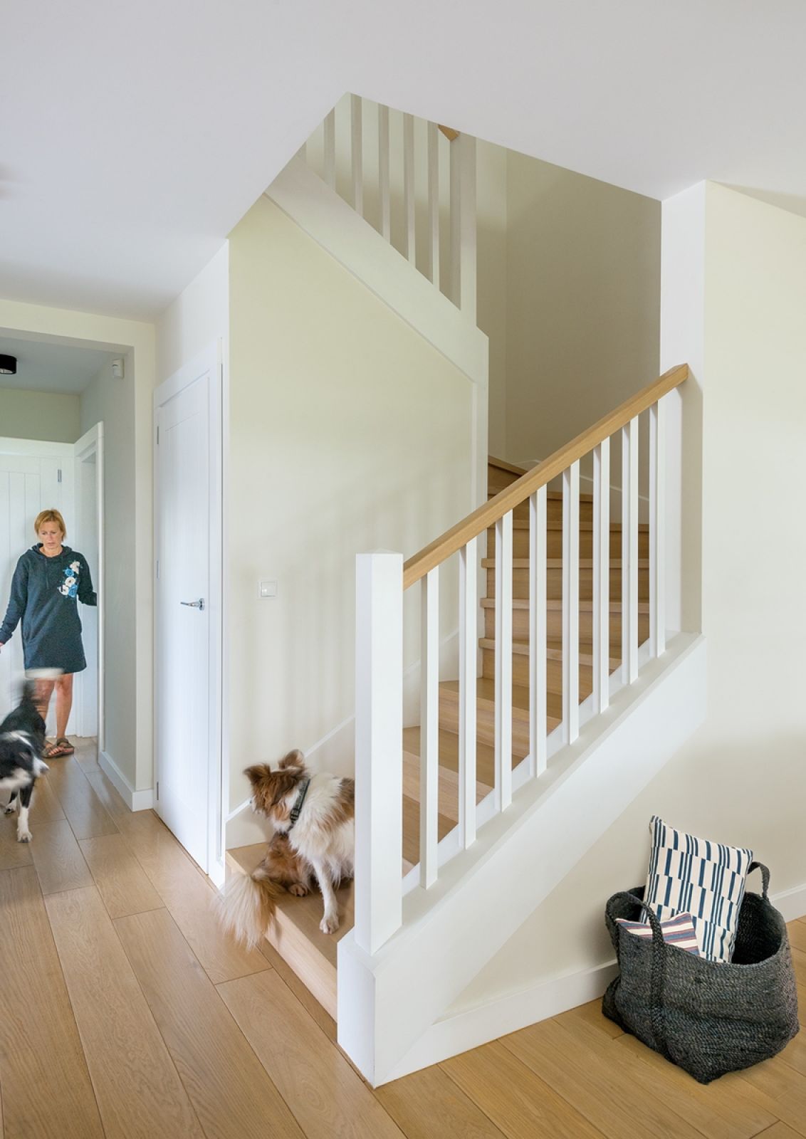 Dom jest pasywny – ogrzewany pompami ciepła, z centralnie sterowaną wentylacją, która odzyskuje ciepło, oraz systemem „smart home”. Za pomocą pilota albo smartfona można sterować roletami, oświetleniem czy regulować temperaturę w poszczególnych pomieszczeniach. Architektka pamiętała także o zwierzętach, bo przyjaciele gospodarzy zawsze chętnie zabierają tu swoje czworonogi. W kotłowni zaprojektowała więc specjalny prysznic dla psów.
