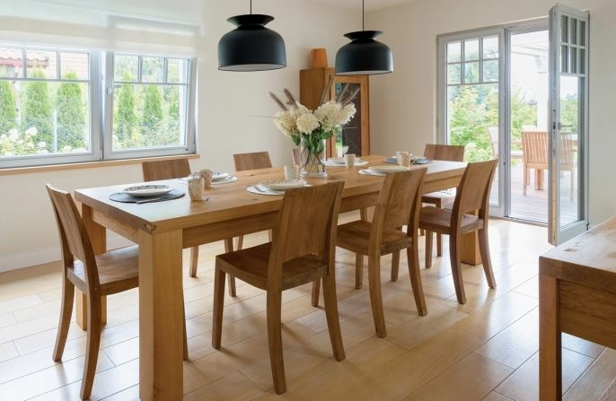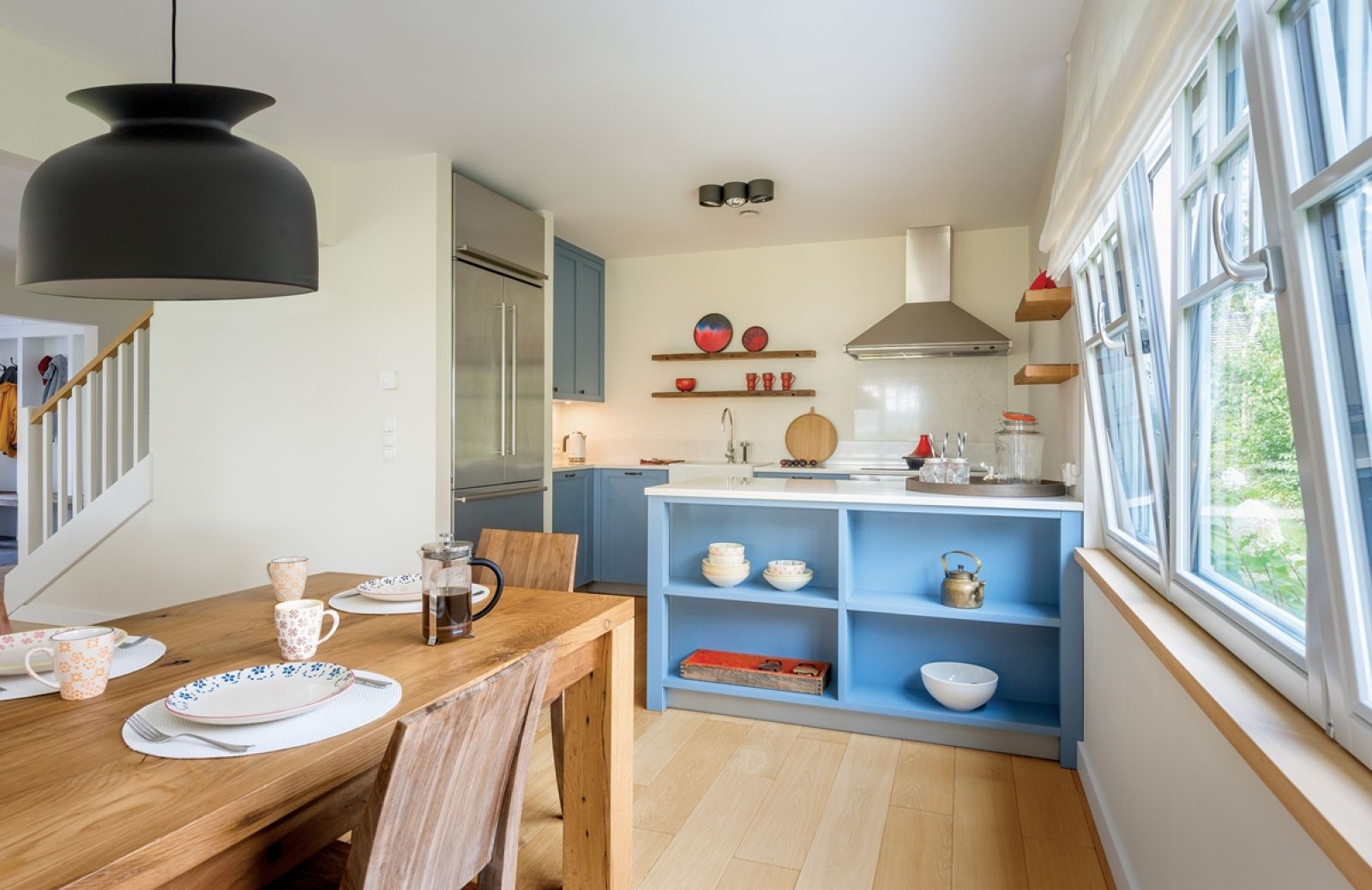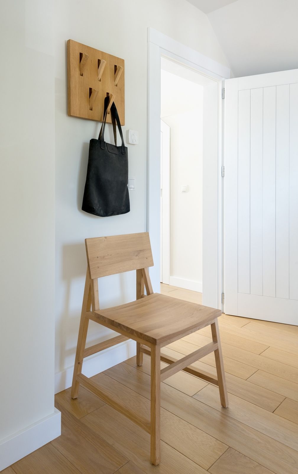 Gościnni gospodarze potrzebowali domu, który w razie potrzeby pomieściłby nawet kilkanaście osób. – Podzieliłam go więc na dwie części –180-metrowy parter dla gości i 80-metrowe piętro dla gospodarzy, zaprojektowałam też więcej łazienek – tłumaczy Joanna Walewska. –Szykując wnętrza, kierowałam się z kolei zasadą „less is more” Miesa van der Rohe, bo to dom wakacyjny. Starałam się ograniczyć liczbę mebli i wyposażenia do minimum – podkreśla architektka. I rzeczywiście – rzeczy jest tu mało, ale za to są niebanalne… stół w jadalni został zrobiony ze 100-letniego drewna pochodzącego z rozbiórki starych domów pod Zwierzyńcem. Nad kominkiem w salonie wiszą wysłużone, kolorowe wiosła do kanadyjskich canoes. To pamiątki właścicielki – przypominają jej o kajakowych wyprawach z dzieciństwa.