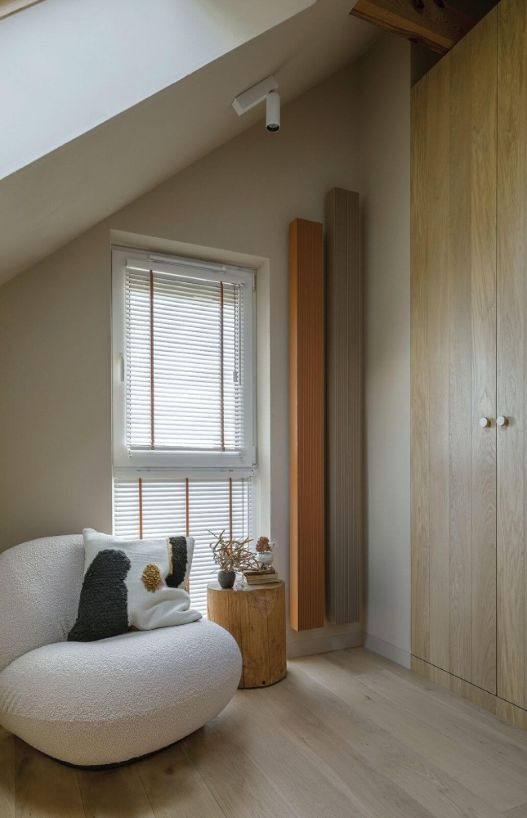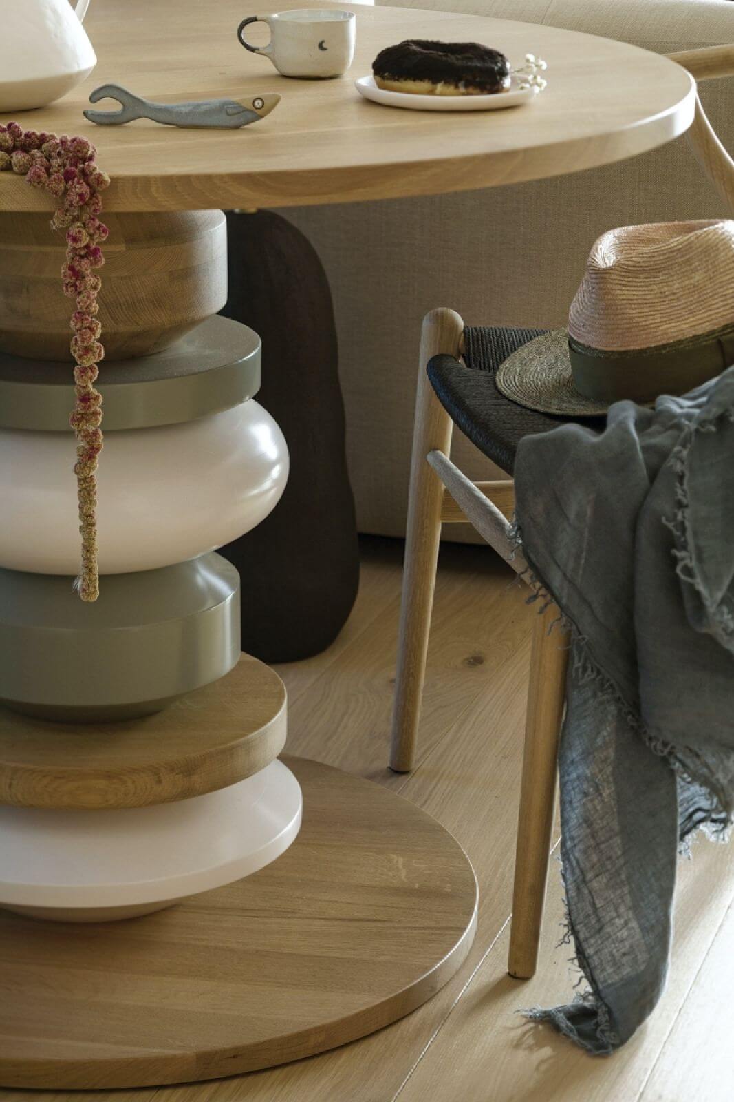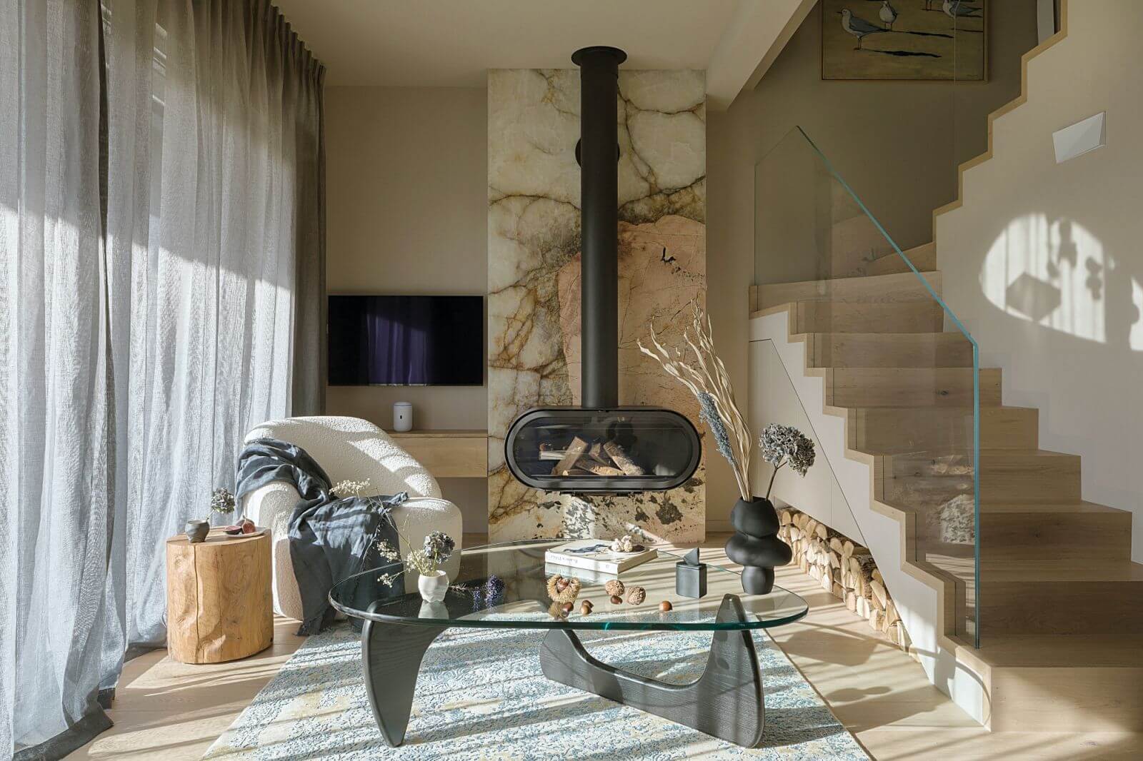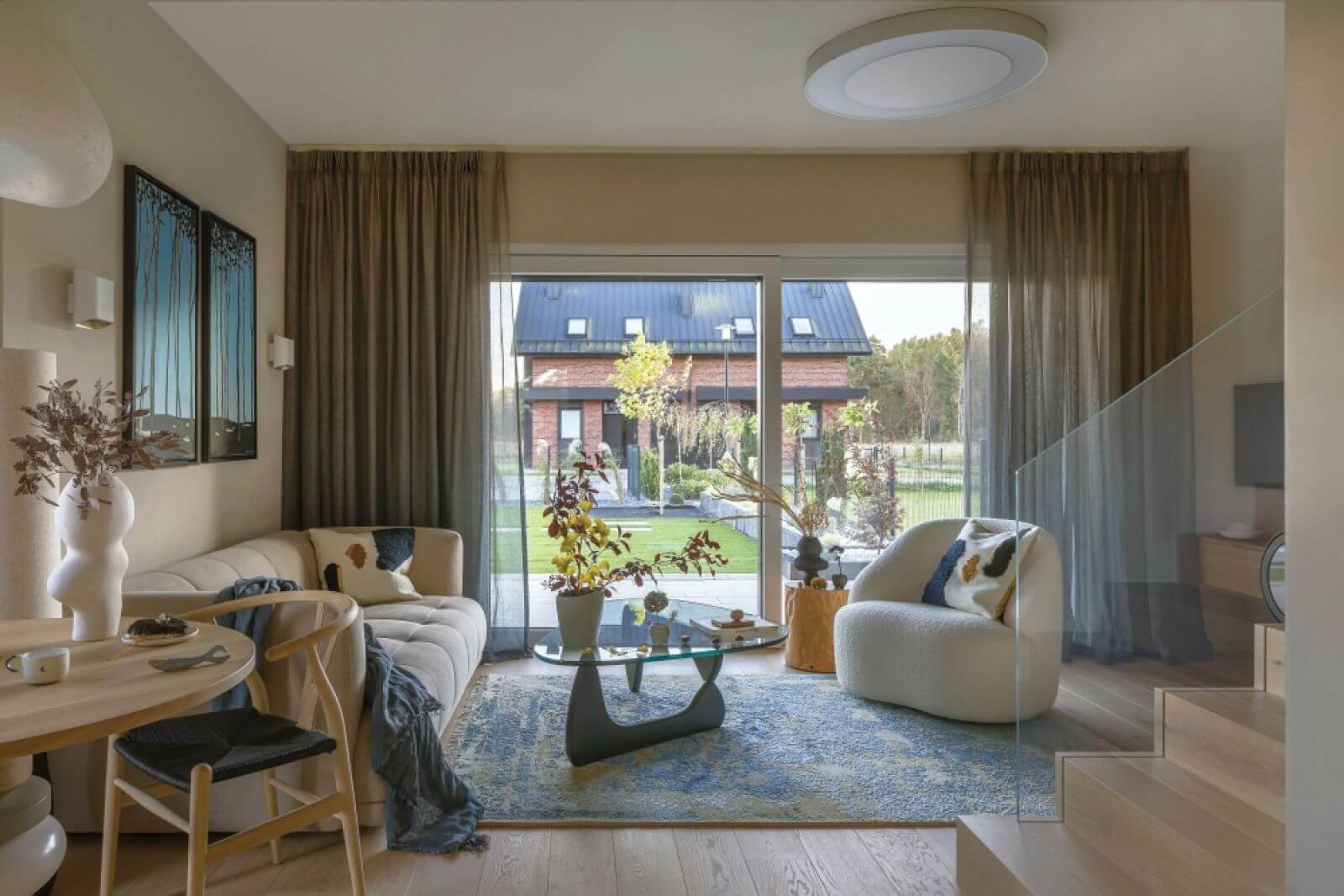 Wysmakowany wystrój dopełniają miękkie, opływowe kształty mebli, często klasyków designu – jak stolik kawowy Vitry czy ikona modernizmu – krzesła Wishbone Hansa J. Wegnera. Ważną rolę odgrywa tu sztuka. Dyptyk z drzewami czy mewy na piasku nawiązują do bałtyckich krajobrazów.