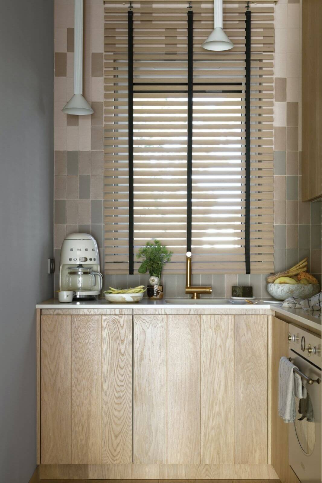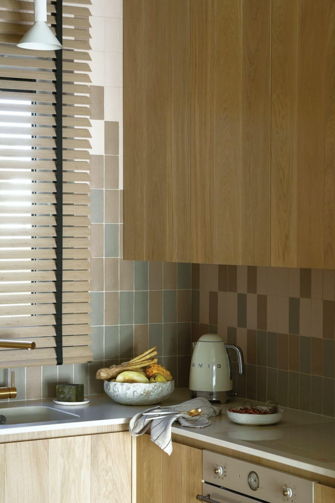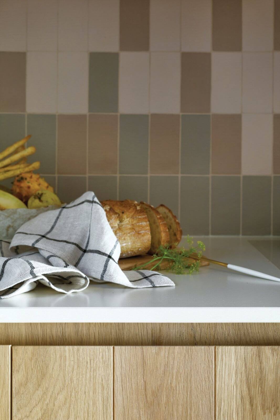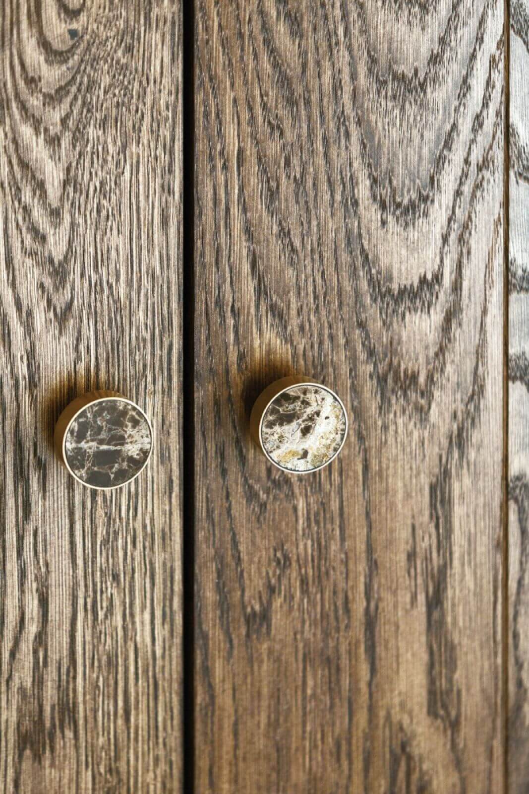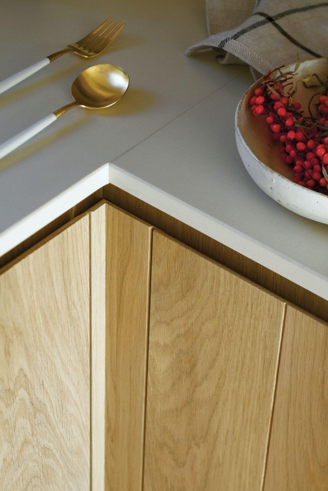 Fronty szaf i mebli kuchennych na przykład powstały z szerokich desek znalezionych tu na miejscu, w nadmorskiej stolarni. Mają piękny rysunek słojów, a drobne niedoskonałości przywodzą na myśl konary wyrzucane na brzeg przez fale.