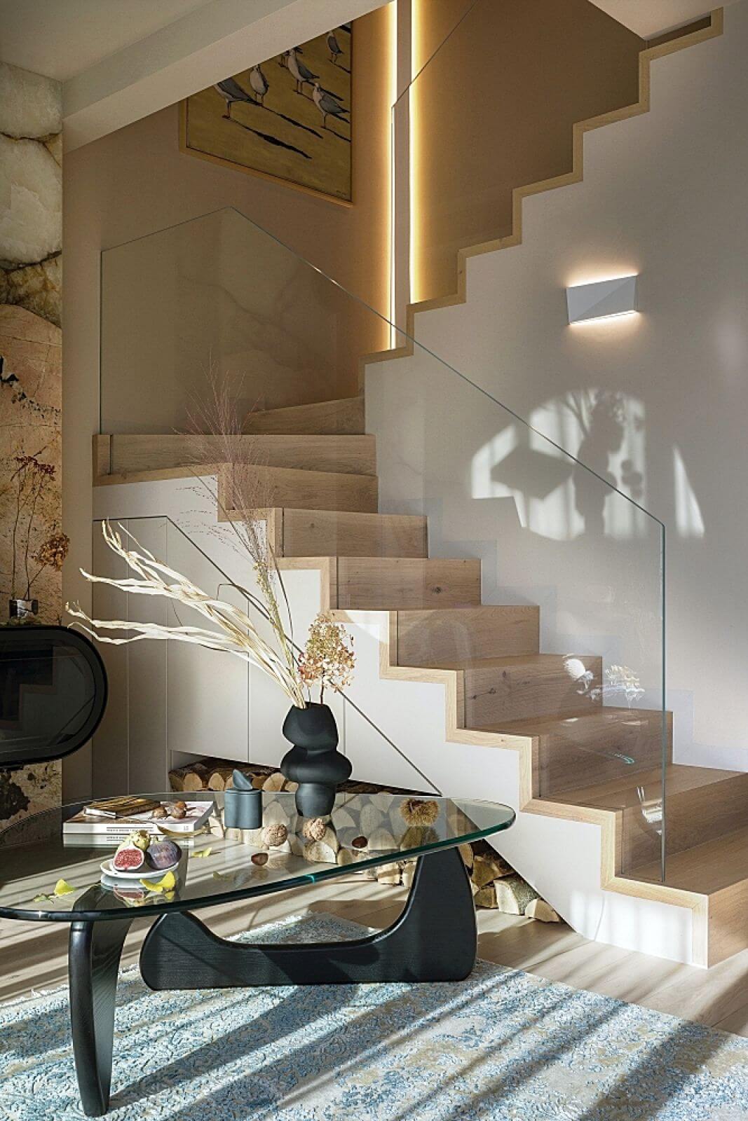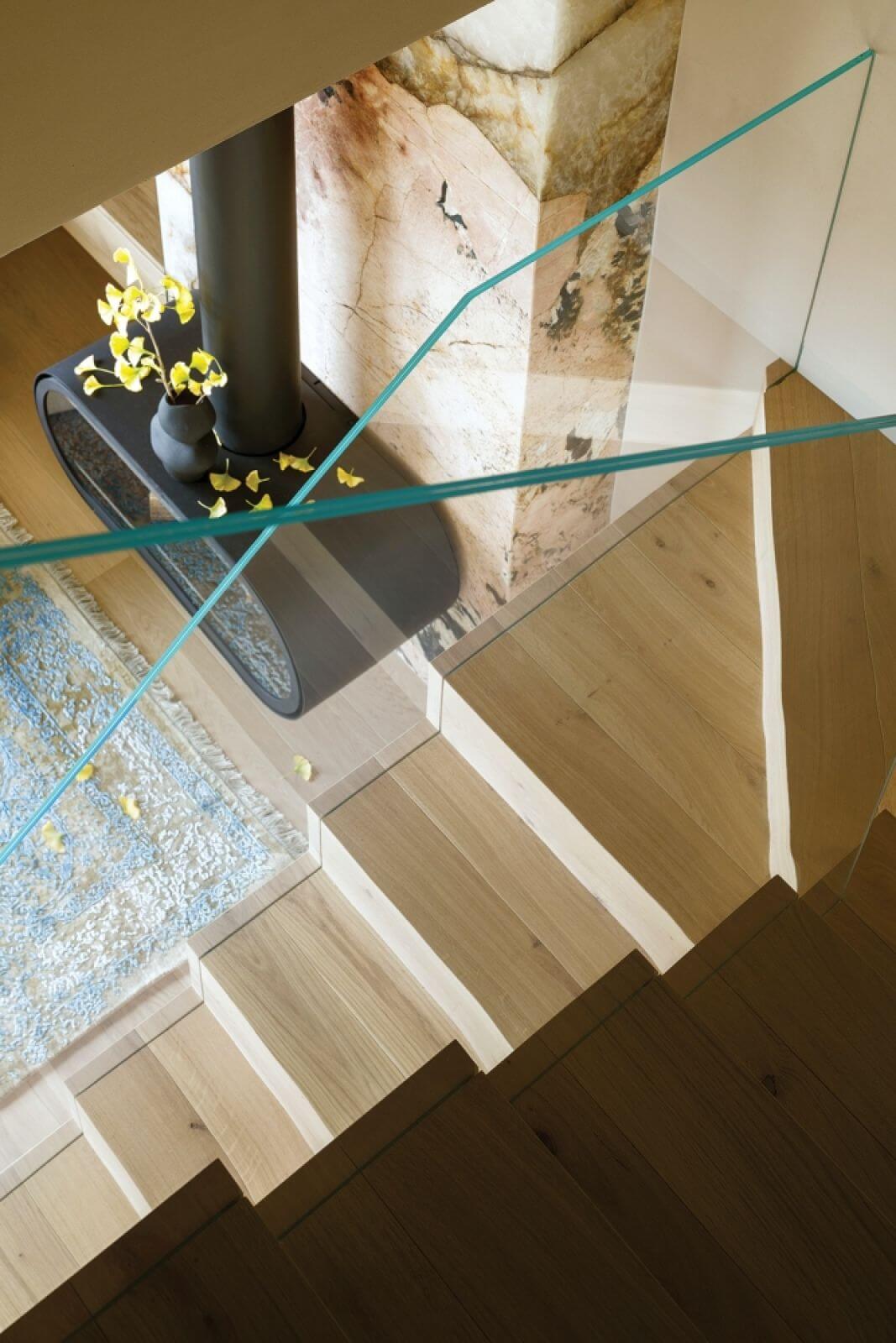 Uwagę zwraca też balustrada schodów – tafla szkła bez jednego łączenia. – Chciałam, żeby schody miały minimalistyczny charakter i nie dominowały w spokojnym salonie – opowiada architektka. – Szkło jest transparentne, zamontowaliśmy je tak, żeby nie było widać żadnych wsporników – wszystkie zostały sprytnie ukryte w stopniach – wyjaśnia.