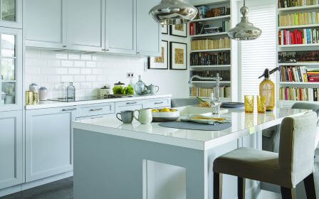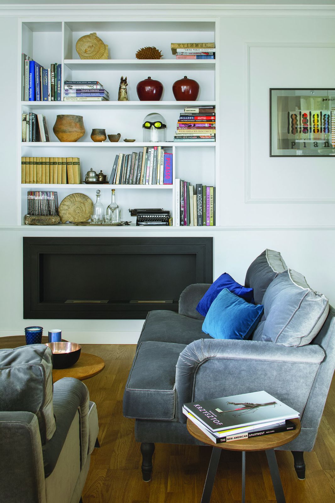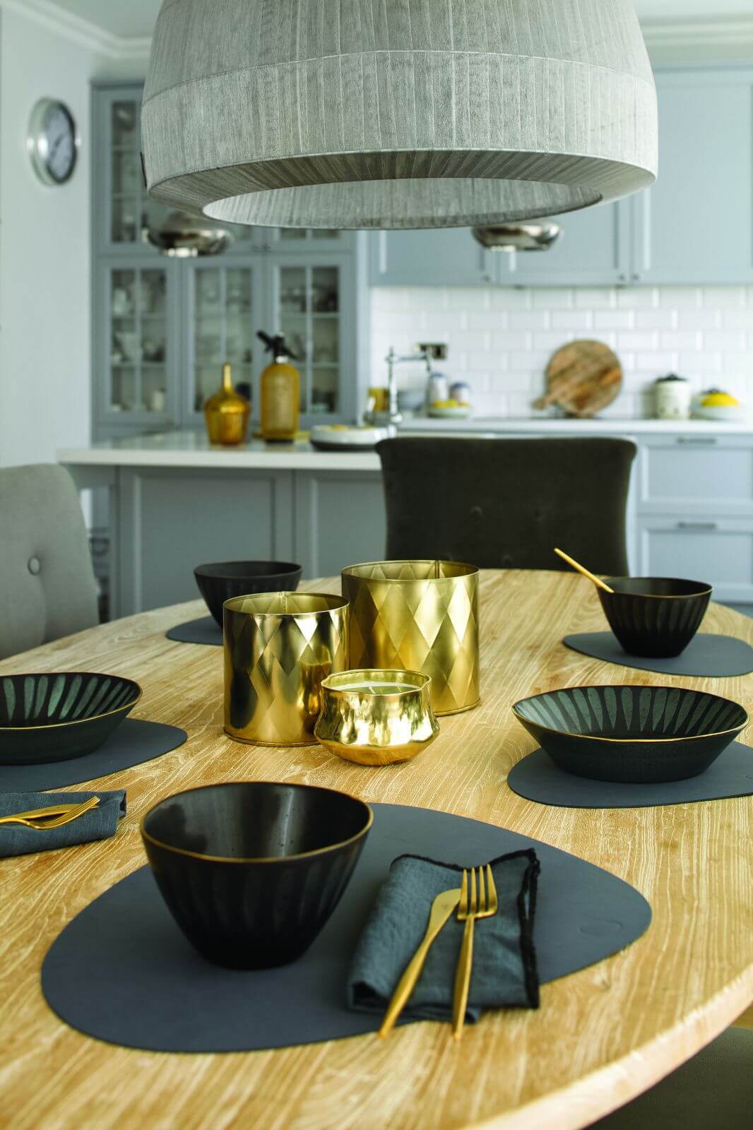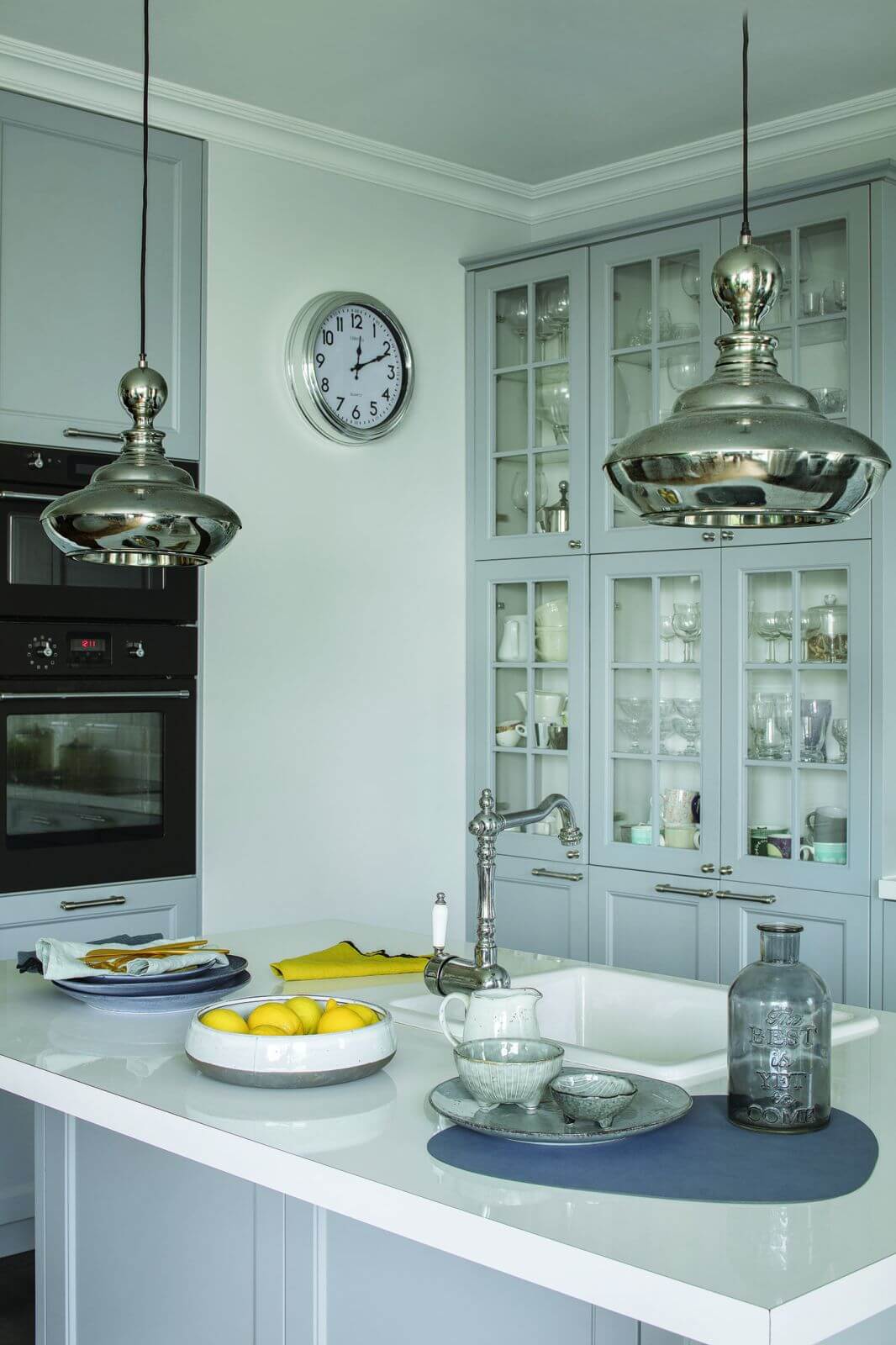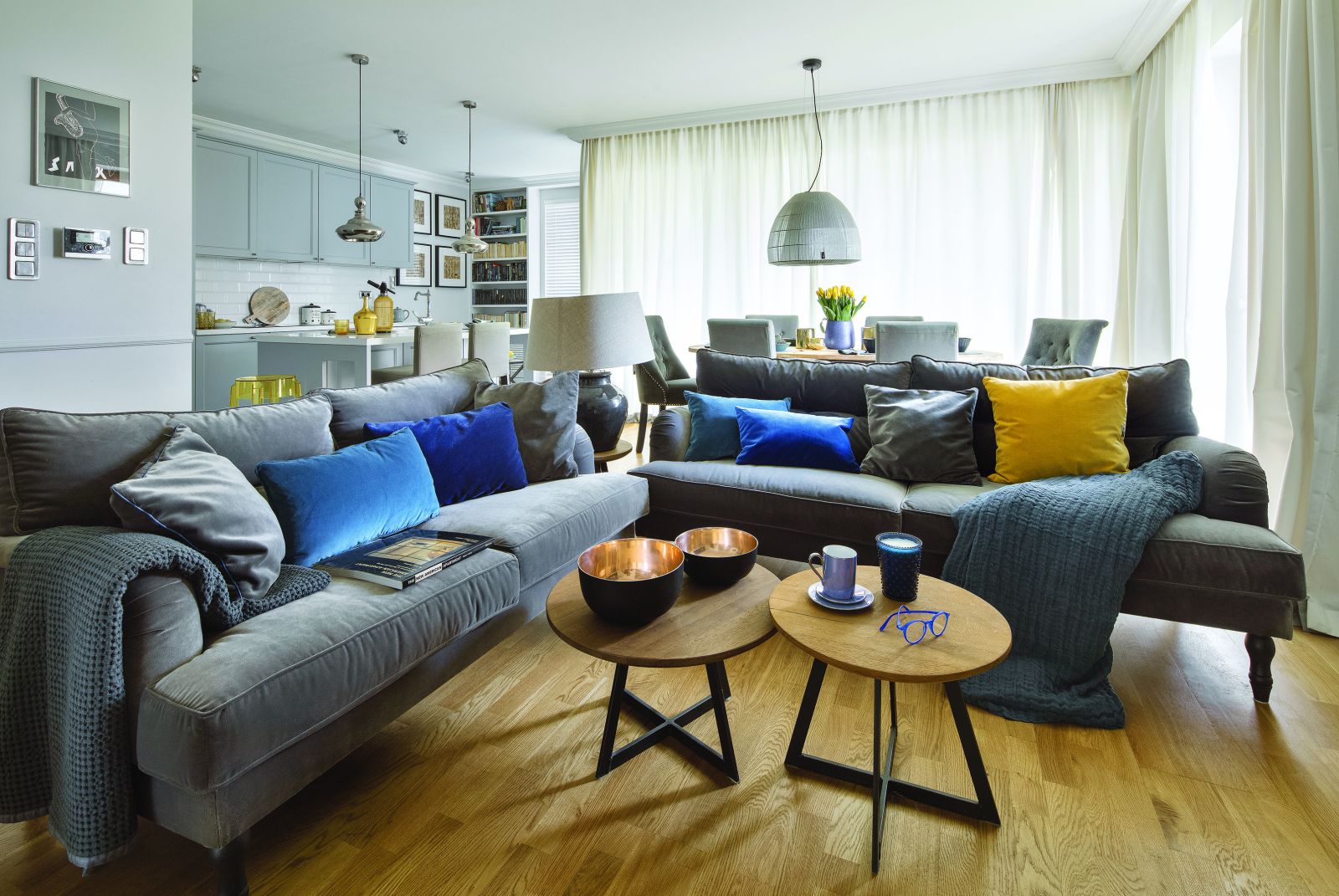 Mój poprzedni dom był drewniany, w ciepłych barwach, do nowego wybrałam chłodną, spokojną tonację – relacjonuje. Dlatego dużo tu szarości, pastelowego błękitu i zawsze eleganckich zestawień czerni z bielą, którą ożywiają złote oraz niebieskie dodatki. Urządzanie zaczęła od kuchni. – Zaprojektowałam szafki do zabudowy i kształt wyspy. Według tego pomysłu wykonali je stolarze z mojego Studia Deccor – opowiada. Pastelowe fronty rozjaśniają i powiększają wnętrze. W podobny sposób powstały kanapy w salonie.