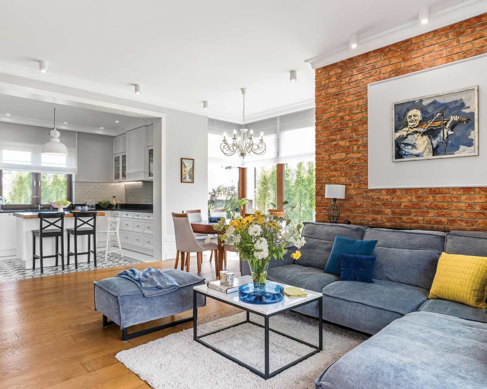 Błękity i cegła na ścianie, czyli wygodna klasyka z nowoczesnością