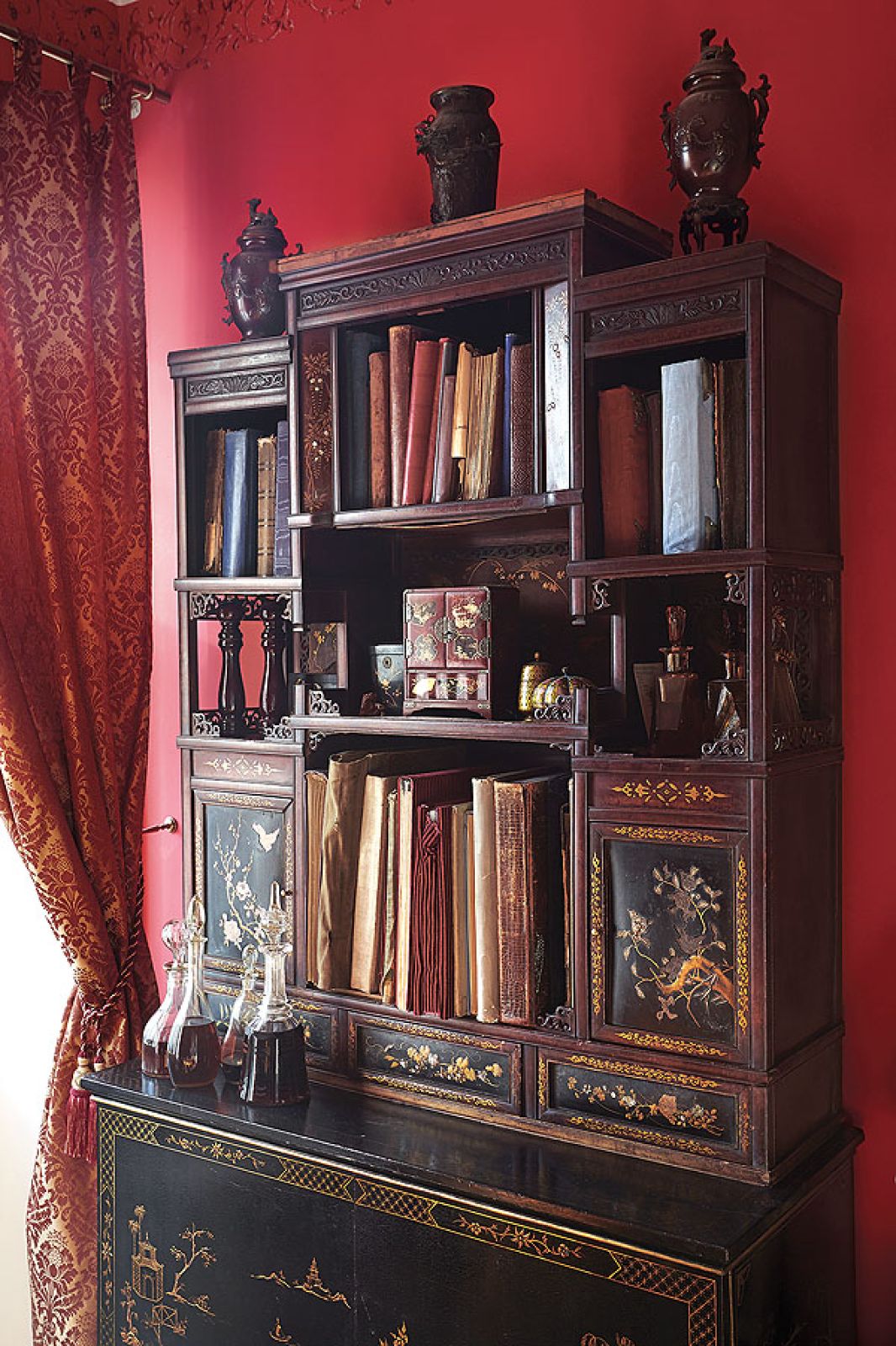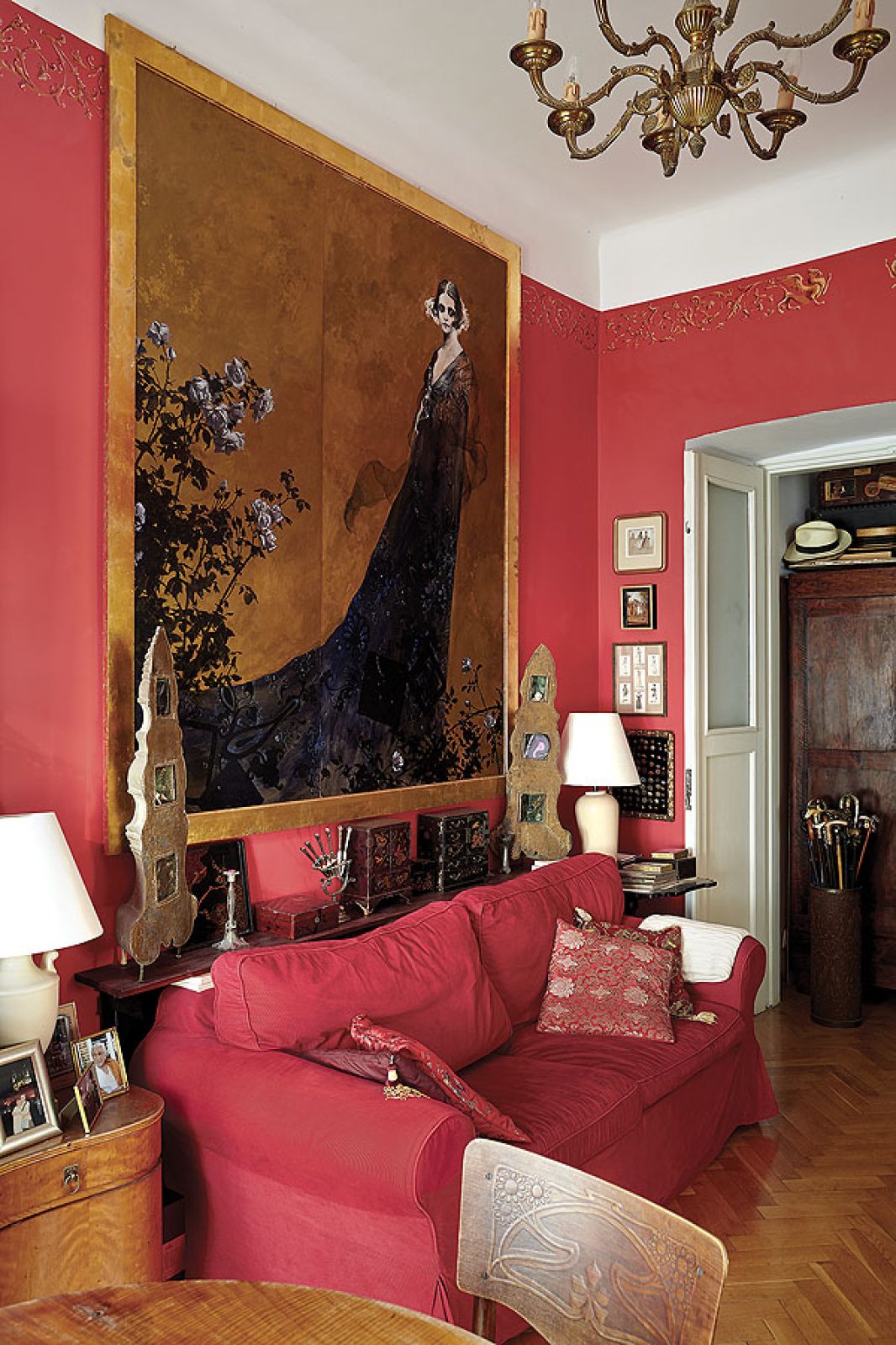 Bardzo dekadencki salon: czerwone ściany i kanapa, zdobione japońskie szkatułki, mięsiste story, a na fryzie pod sufitem wzór z gryfami. Skąd ta stylistyka?