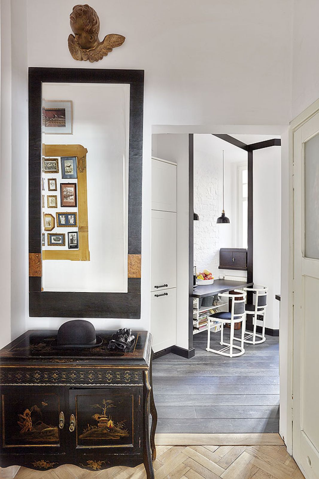 Czarne pasy na ścianach są wzięte z komódki Carla Witzmanna, podłoga z palonego dębu z wtartą bielą – z ulubionego drewna Josefa Hoffmanna, który barwił dąb na czarno i nacierał go kredą. Jedyny autentyczny kawałek Wiener Werkstätte to krzesła zaprojektowane właśnie przez Hoffmanna w 1906 roku dla kabaretu Fledermaus. Kupiliśmy je w strasznym stanie, daliśmy do reperacji i pomalowaliśmy tak jak w pierwotnym projekcie.