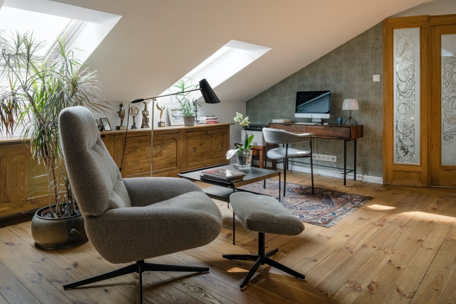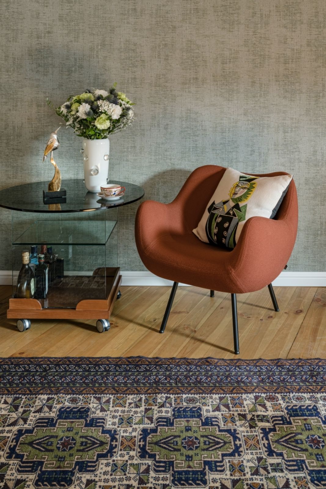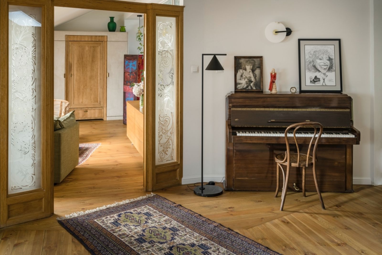 Naprzeciwko pianina znajduje się kącik wypoczynkowy dla gości, który idealnie sprawdza się podczas muzycznych spotkań z przyjaciółmi. Tworzą go dwa bliźniacze fotele RM58 projektu Romana Modzelewskiego (Vzór) w wersji tapicerowanej i szklany stolik vintage. Stoi na nim „Bursztynowy Słowik”, którego artystka zdobyła podczas Festiwalu w Sopocie. Pod ścianą ze skosem, podobnie jak w salonie, rozciąga się drewniana zabudowa, która kryje pojemne szafki. Meble zostały poddane renowacji, zdjęto z nich białą farbę, odkryto naturalne słoje drewna, a także wymieniono kratki maskujące grzejniki, na ich miedziane odpowiedniki.