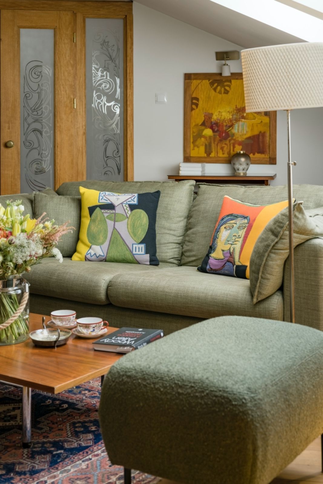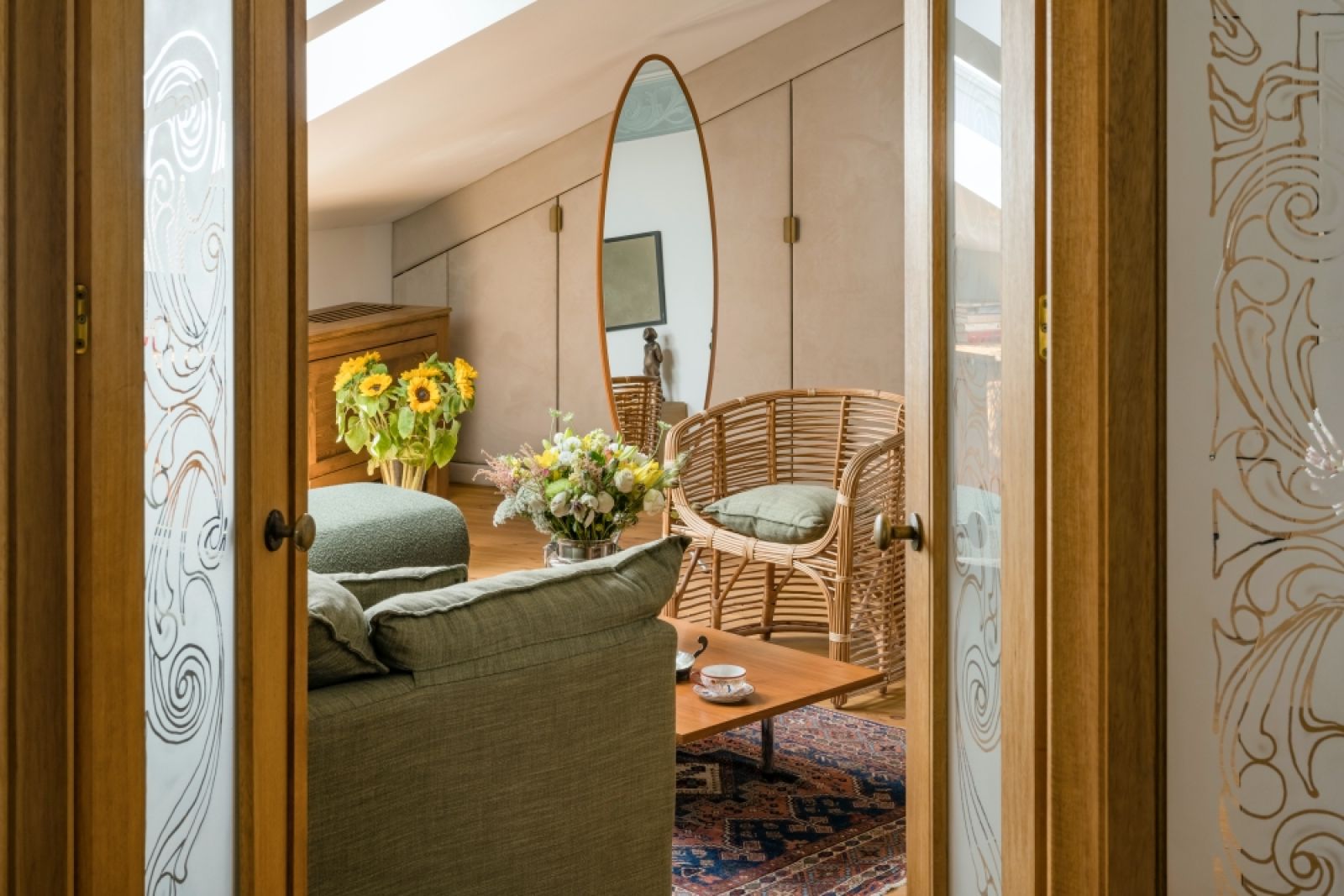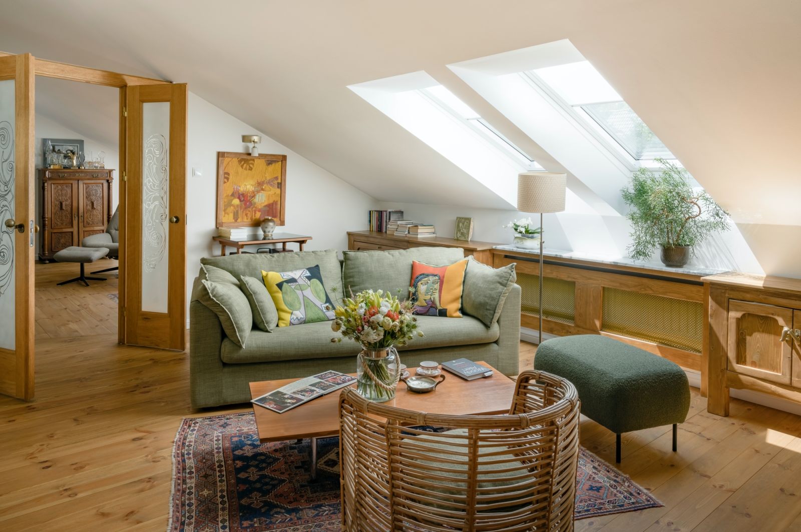 Naprzeciwko pianina znajduje się kącik wypoczynkowy dla gości, który idealnie sprawdza się podczas muzycznych spotkań z przyjaciółmi. Tworzą go dwa bliźniacze fotele RM58 projektu Romana Modzelewskiego (Vzór) w wersji tapicerowanej i szklany stolik vintage. Stoi na nim „Bursztynowy Słowik”, którego artystka zdobyła podczas Festiwalu w Sopocie. Pod ścianą ze skosem, podobnie jak w salonie, rozciąga się drewniana zabudowa, która kryje pojemne szafki. Meble zostały poddane renowacji, zdjęto z nich białą farbę, odkryto naturalne słoje drewna, a także wymieniono kratki maskujące grzejniki, na ich miedziane odpowiedniki.
