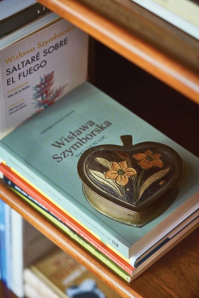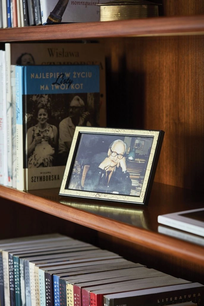Przy lustrze na wprost drzwi wisiały jej zdjęcia pod tablicami z dziwnymi nazwami miejscowości. Dziś wszystkie są na poświęconej jej wystawie w Kamienicy Szołayskich, tak jak wiele rzeczy, które tu miała. Pomysłu noblistki jest też szersza dolna półka na regale z książkami w salonie. Przydawała się dwa razy do roku, gdy z okazji rocznicy śmierci swoich mężczyzn – Adama Włodka i Kornela Filipowicza – organizowała tak zwane panichidy. Zaczynały się wspominkami i paleniem papierosów na cmentarzu, a potem cała grupa była zapraszana tu na żurek – bywało ze dwadzieścia osób, więc część siadała właśnie na tej półce.