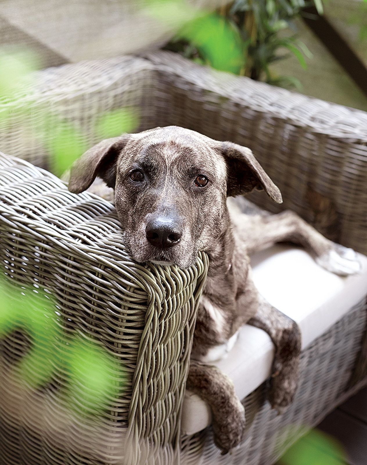 Wtedy były dwa psy i kot. Mała suczka Dolly niedawno umarła, miała 18 lat, mojej kotki Józi też już nie ma. Została sześcioletnia Tycia, wielkie psisko, która jako szczeniak była najmniejsza z miotu i stąd jej imię. Po dziadku dostała umaszczenie amstafa, więc swoim wyglądem wywołuje panikę, szczególnie u rodziców z dziećmi, ale jest łagodna, wręcz ciapowata. Bardzo lubi leżeć na tarasie i patrzeć, co się dzieje. Nie mogę przeboleć, że na podwórku wycięto sporo drzew, bo balkon był w nich schowany. Jedno drzewo przewróciło się podczas wichury i profilaktycznie wycięto kilka innych, nawet bzy, nim zdążyliśmy zareagować.