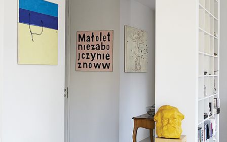 Prezent ślubny od Henryka Stażewskiego. To także przedmiot, z którym przeprowadzam się od ponad 30 lat. Z tyłu jest dedykacja imienna dla mnie, więc jak się rozwodziliśmy, mój mąż nie miał nic przeciwko, żebym go zatrzymała. W tamtej części, nazwijmy ją kuchenną, testują się natomiast obrazy moich byłych studentek, debiutantek. Sprawdzam, jak mi się żyje w ich otoczeniu.