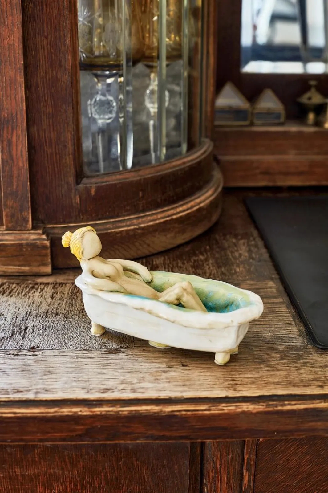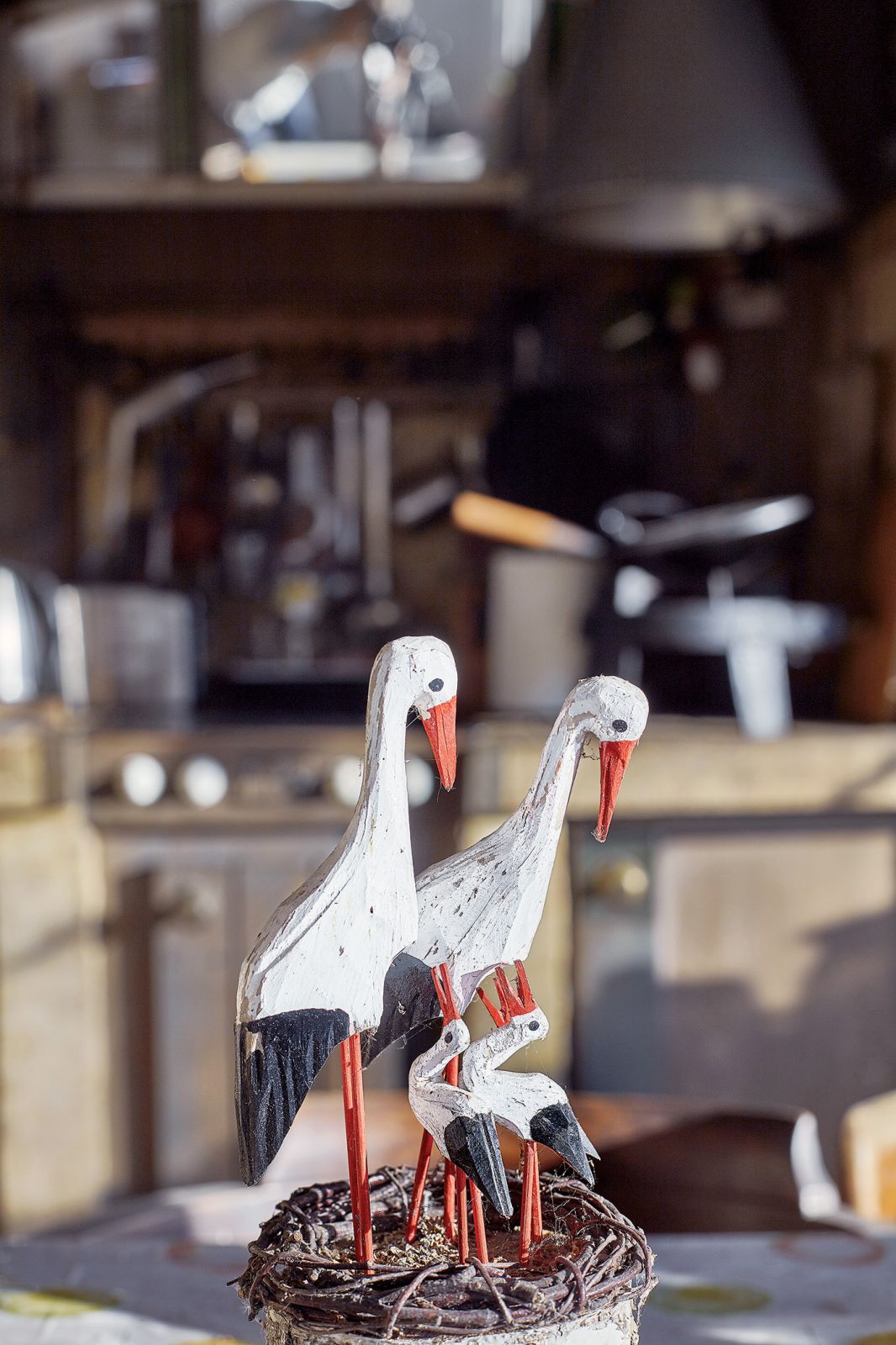 Jest ich wiele, ale skoro pytasz o gniazdowanie, to spójrz na tę drewnianą figurkę bocianów. Ta ptasia rodzina jest nietypowa, bo poza dwoma dorosłymi boćkami, czyli nami, siedzą w nim jeszcze trzy małe: Agatka, Mateusz i Franek. Kiedy poznałam męża, Andrzeja, nasze starsze dzieci były rówieśnikami, miały po pięć lat. Potem pojawił się na świecie nasz wspólny Franek. Mam jeszcze dwie córki chrzestne. Tą glinianą figurkę kobiety w wannie własnoręcznie zrobiła na moje urodziny Bronka Zamachowska, najmłodsza córka Zbyszka i Oli, moja chrześnica. Bardzo zdolna osóbka. Drugą moją chrześnicą jest Weronika Olbrychska, córka Zuzi Łapickiej i Daniela, ale siedzi w Ameryce i z nią mam słabszy kontakt. Za to wiele wspomnień.