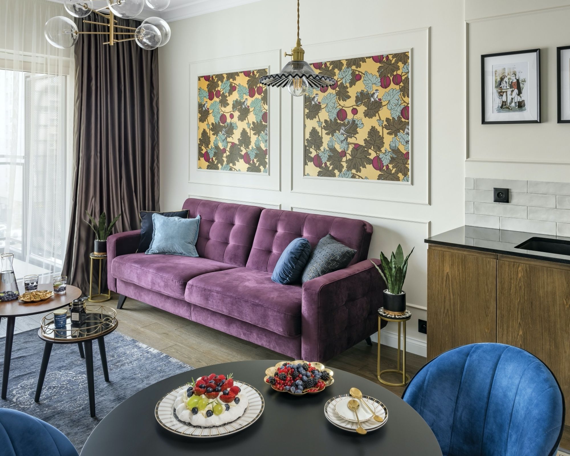 W 34-metrowym mieszkaniu udało się zaaranżować osobną sypialnię z oryginalnym przejściem do salonu, stylową łazienkę oraz kuchnię z minigalerią. Kolorytu niedużej kawalerce dodaje aksamitna tapicerka i tapety jak obrazy.