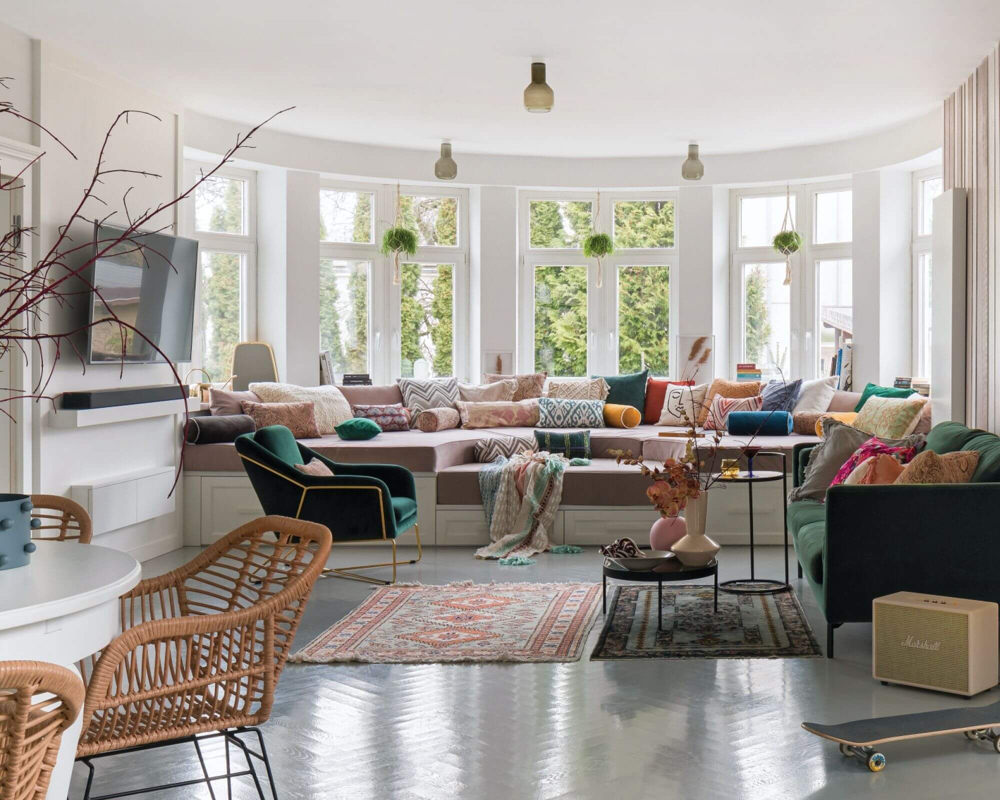 Dom typu kostka stworzony do odpoczywania – wnętrza urządzono pomysłami z podróży. Wykusz pełen poduszek zachwyca!