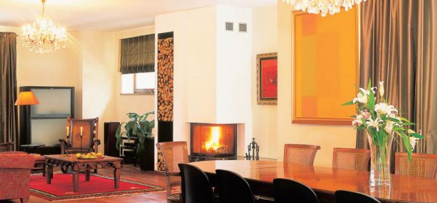 Do domu Moniki i Thomasa wchodzimy przez otwarty kamienny korytarz, wyglądający jak kładka lub chodnik, który prowadzi do pomieszczeń urządzonych oszczędnie, ale za to designerskimi meblami i przedmiotami. Na dole część gościnna: kuchnia połączona z salonem, a w nim kominek jak rzeźba. Drewno, którym obłożono ścianę obok, pełni rolę ruchomej instalacji. To pomysł gospodarza. Przy stoliku fotele w stylu Arts & Crafts. Thomas tłumaczy, że to amerykańska odmiana art-déco.