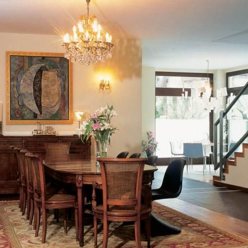 Fotele Gustawa Sticle’a z 1912 roku powstały bez użycia ani jednego gwoździa, a ich awangardowa forma doskonale pasuje do współczesnych czasów. W jadalni obok jest imponująca lampa „Zettel'z 5” projektu Inga Maurera z białymi kartkami, na których rodzina i goście wypisują Klodowskim życzenia. Ona też przeszła już do historii designu.