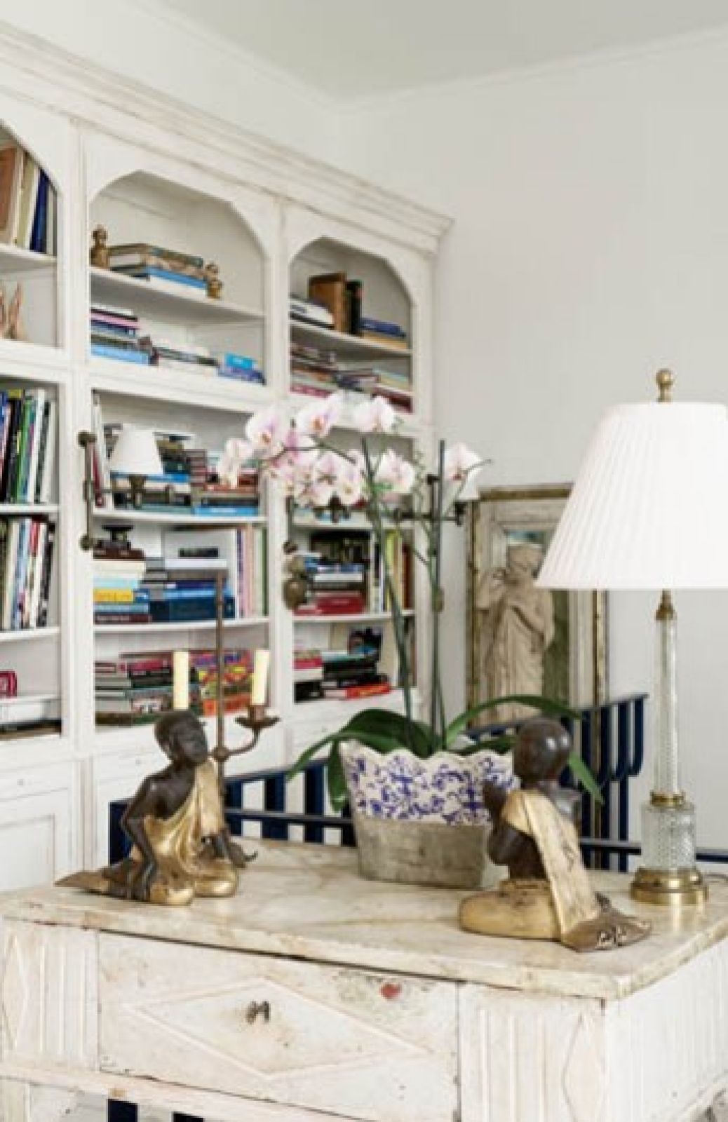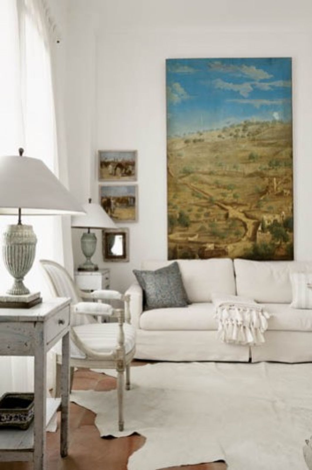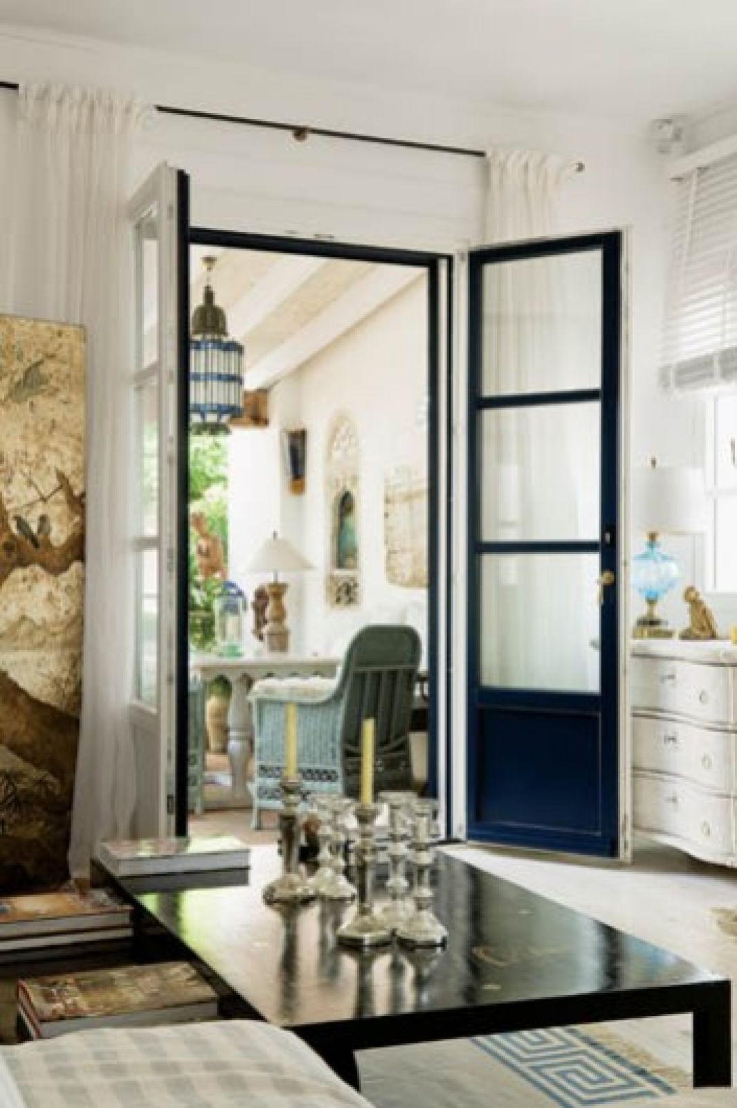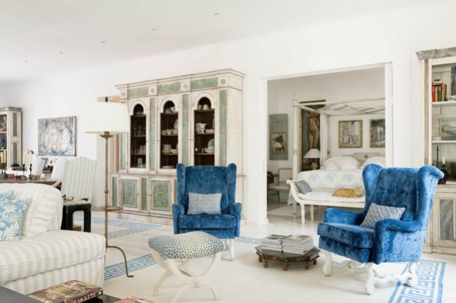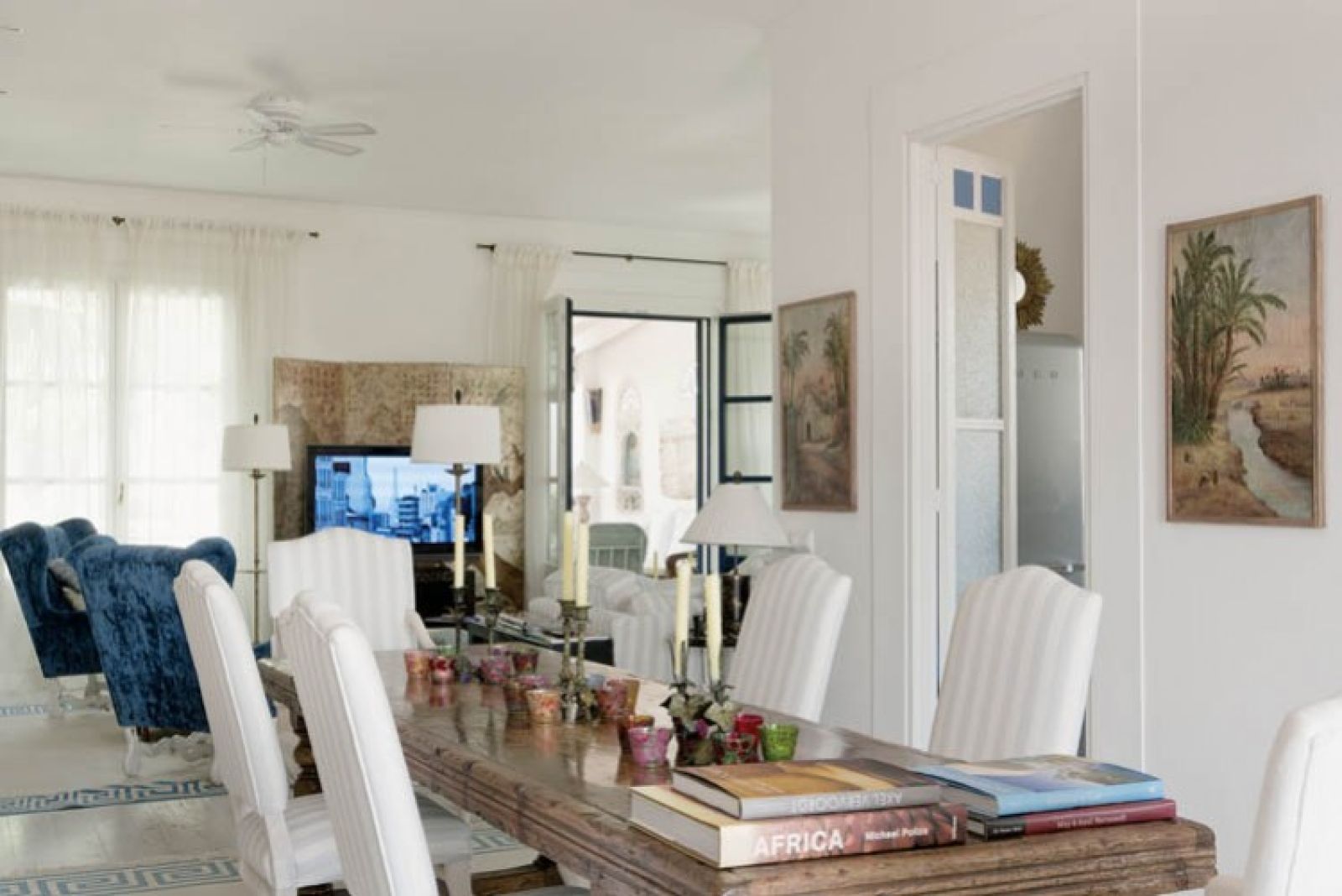 Meble z kolei to staranna mieszanina przedmiotów nowych i starych. W jadalni wzrok przykuwa XVIII-wieczny stół z Toskanii, z tego samego okresu pochodzi francuski kominek, zwieńczony zdobnym trumeau. Nowsze sprzęty Holger kazał pomalować na kolor piaskowca i gdzie trzeba, obić tkaninami w odcieniach błękitu. Część przedmiotów trafiła tutaj ze starego domu, jak na przykład para francuskich foteli czy XIX-wieczne obrazy przedstawiające scenki z życia na Bliskim Wschodzie.
