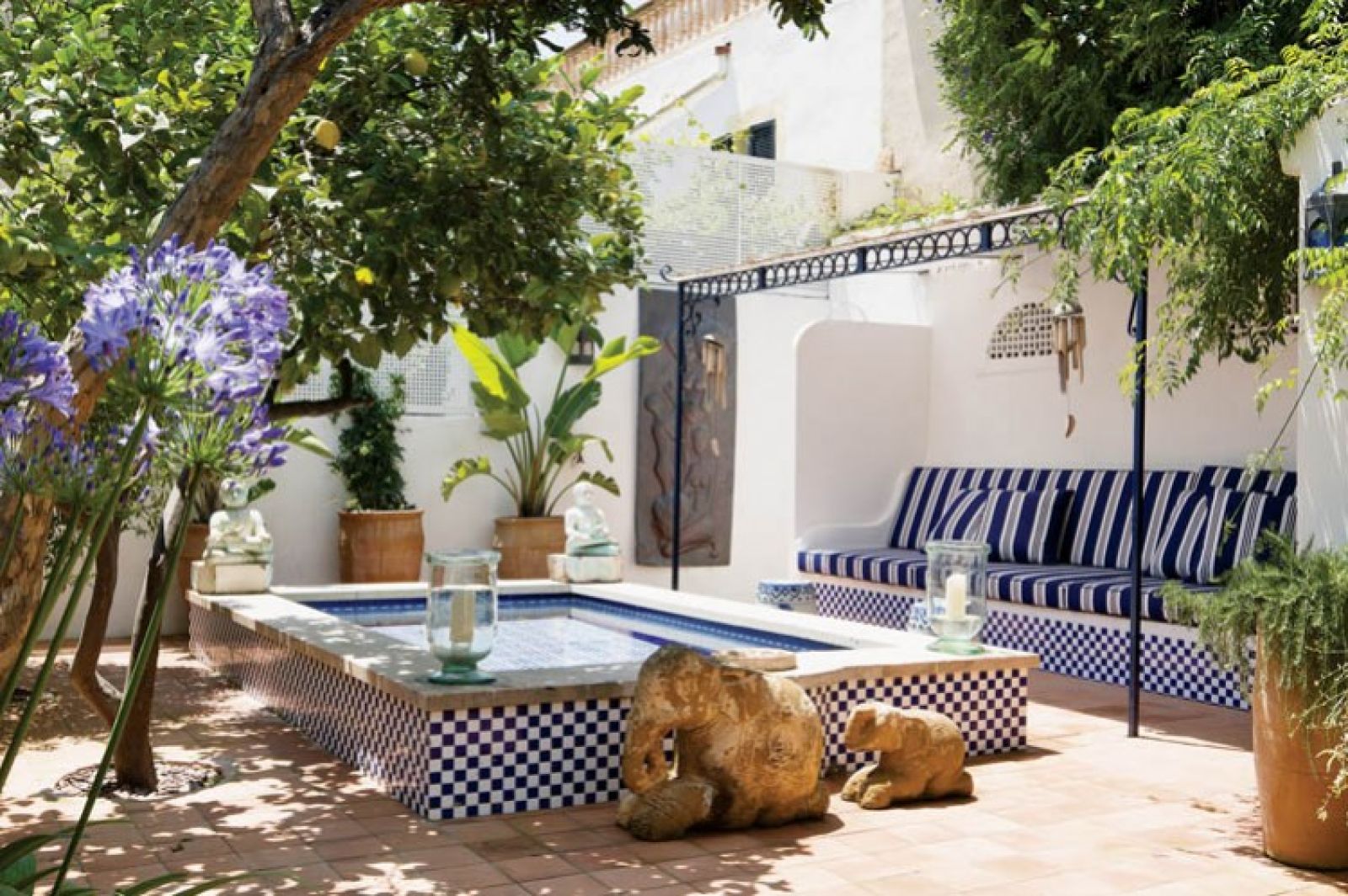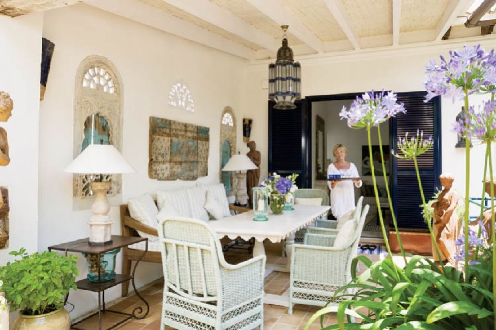 Wystrój domu łączy estetykę Mykonosu, Marakeszu i Majorki. Na greckiej wyspie Holger i Marion mieli niegdyś dom wakacyjny, przenieśli więc parę rzeczy do nowej siedziby. Marakesz z kolei odwiedzali kilka razy i zrobił na nich ogromne wrażenie. Dlatego właśnie postanowili pomieszać wpływy mauretańskie ze śródziemnomorskimi. Biel, jasny piaskowiec i błękit idealnie komponują się z arabskimi kafelkami na patio. Na dodatek takie zestawienie kolorów nadaje wnętrzu chłodną, ale i przytulną atmosferę – odpowiednią do klimatu gorącej wyspy.