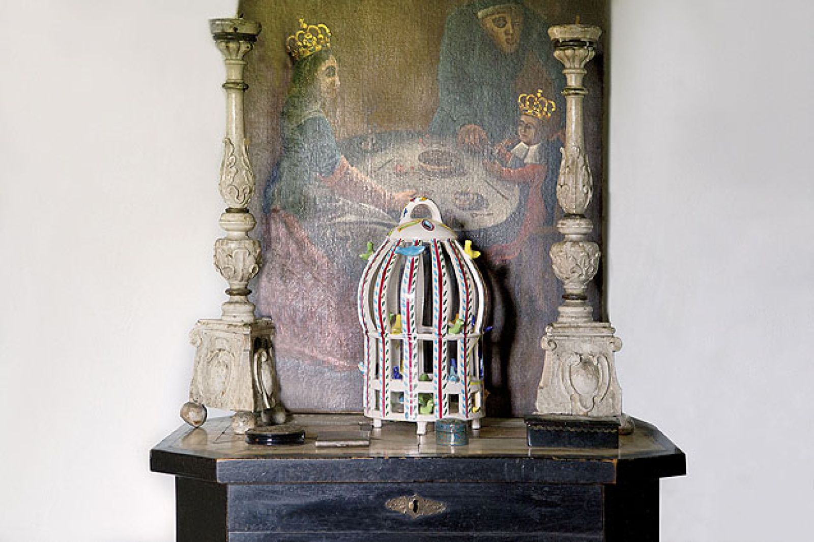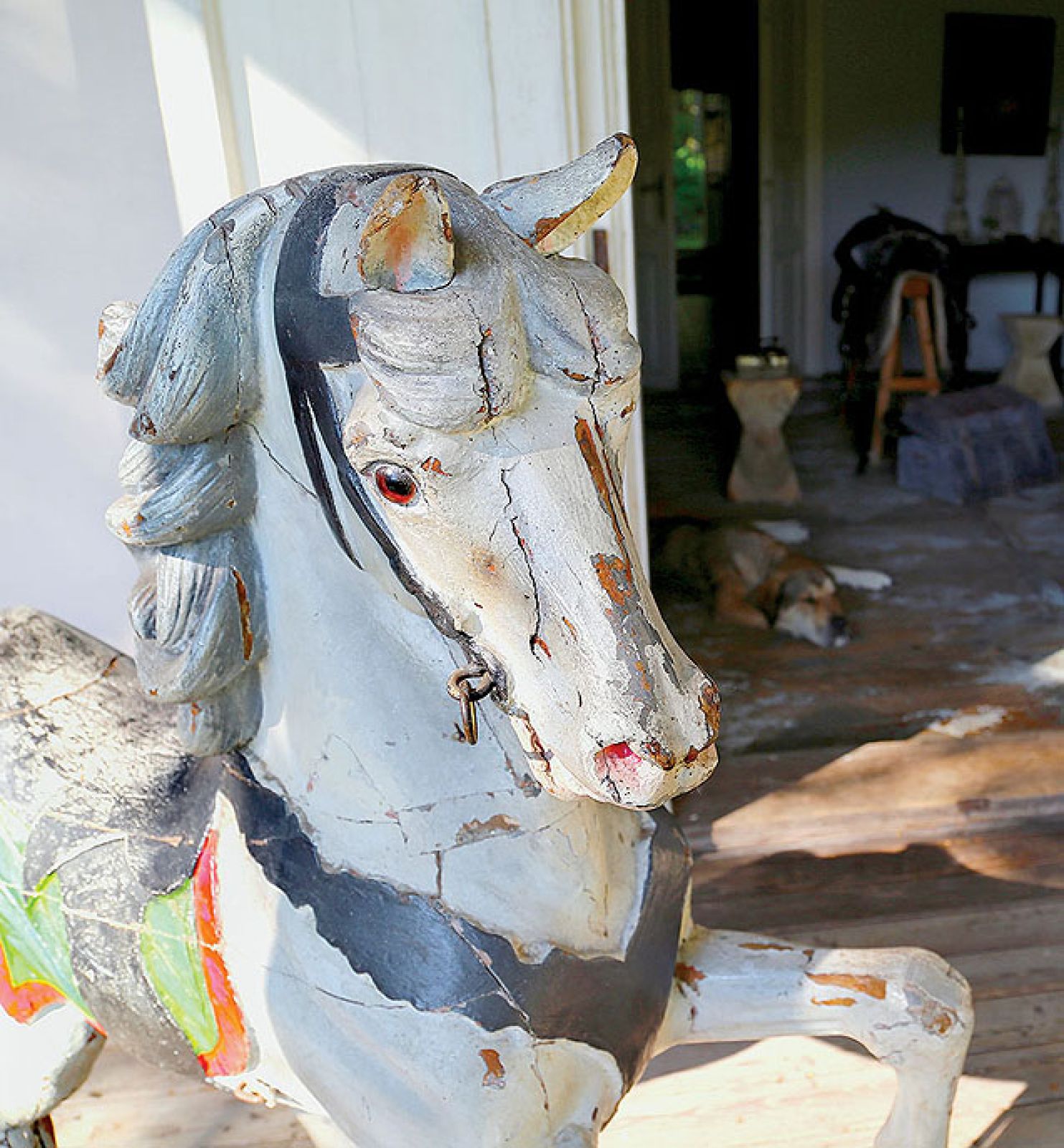 On jest cały taki mój… To jak z końmi, nie umiem powiedzieć, którego kocham najbardziej. Tu jest klatka na ptaki, którą moja Mama przywiozła z Indii, tutaj drewniany koń z karuzeli, którego dostałam od Taty. Wejścia strzegą dwaj żołnierze ze scenografii Allana Starskiego z „Pierścionka z orłem w koronie”. Bardzo lubię te stare okna z bąbelkami powietrza uwięzionymi w szybach, które w sumie powinnam dawno wymienić. Zimą, jak się dobrze nagrzeje, to ciepło tak przez szpary ucieka, że śnieg topnieje. Dom jest modrzewiowy, bez fundamentów, więc pełno tu szczelin. Na zimę schodzą się przez nie ropuchy. Łażą po domu w nocy i cudnie śpiewają. Uwielbiam moje ropuchy!