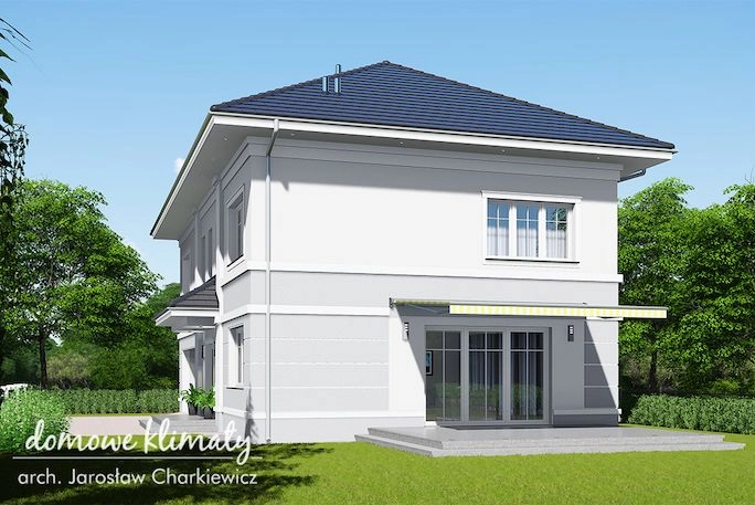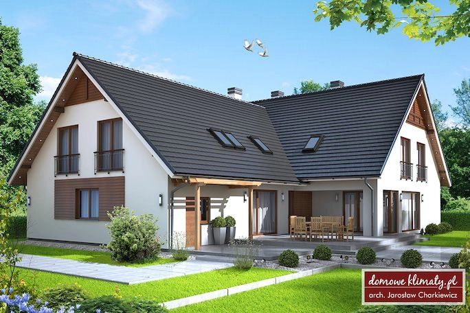 Pracownia Domowe Klimaty ma w zanadrzu też nieco bardziej klasyczne rozwiązania. Jeśli inwestor jest fanem dawnych, polskich rezydencji, czyli dworków, to „Dwa Światy II” powinny idealnie wpisać się w jego zainteresowania. Oczywiście najważniejszym punktem jest wejście do domu – po schodach, z uwzględnieniem dwóch kolumn po boku. Taką nieruchomość warto osadzić na działce nieco cofniętą, z odpowiednio przygotowanym, reprezentacyjnym podjazdem. Również wielospadowy dach wraz z charakterystycznymi półokrągłymi oknami buduje niepowtarzalny klimat. A wewnątrz? Nowoczesny dom z otwartym salonem i wszystkimi potrzebnymi pomieszczeniami!