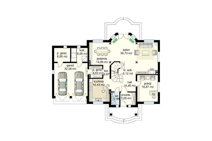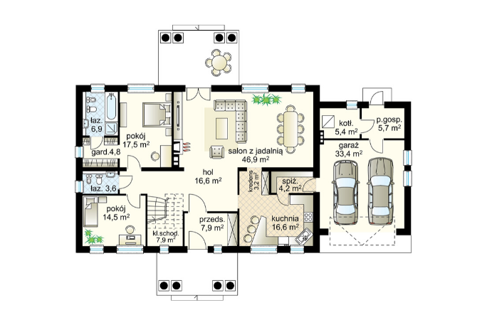 Poddasze użytkowe zostało zaprojektowane tak, że nieruchomość świetnie się sprawdzi w roli podmiejskiej rezydencji, w której śmiało można przyjmować gości. Pozostałe aspekty tej propozycji w niczym nie odbiegają od klasycznego, nowoczesnego budownictwa.