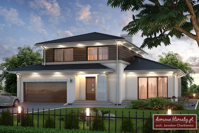 Oprócz prostej fasady, zwieńczonej czterospadowym dachem o kącie nachylenia 30 stopni, przyszły mieszkaniec ma do dyspozycji wszystkie najpotrzebniejsze pomieszczenia. Ponownie garaż jest dwustanowiskowy, scalony z nieruchomością. Dwa salony zostały zastąpione jednym, lecz za to połączonym z kuchnią w modnej koncepcji open space. Jedna łazienka umiejscowiona została na parterze, zaś dwie kolejne na piętrze, gdzie znalazła się również pralnia. Ciekawym miejscem jest strych o powierzchni ponad pięćdziesięciu metrów. Ponadto piętro obfituje w cztery ustawne pokoje, w tym jeden z garderobą i prywatną łazienką.