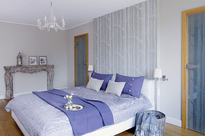Wzór tapety za łóżkiem został wypiaskowany na szklanych drzwiach. Fot. Marcin Zięba Finch i Katarzyna Sawicka