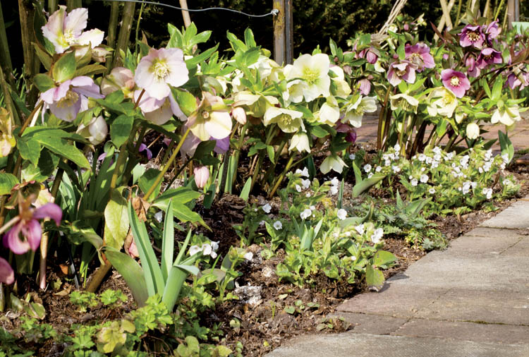 • Do terakotowego dzbana prowadzi rabata z żonkilami, ciemiernikiem wschodnim i śnieżnikiem Forbesa Pink Giant . Ten