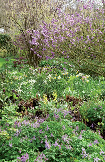 • Fioletowo kwitnący wawrzynek wilczełyko, pod nim ciemierniki, narcyze i hosty.