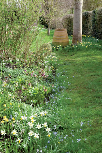 Do terakotowego dzbana prowadzi rabata z żonkilami, ciemiernikiem wschodnim i śnieżnikiem Forbesa 'Pink Giant'. Ten ostatni w latach 70. zaczął znikac z ogrodów i dziczeć. Dziś wraca do łask.