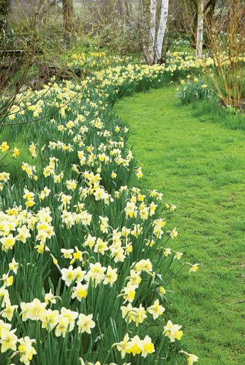 • Bladożółte żonkile ładnie wyglądają na tle zielonej murawy i białej kory brzóz.