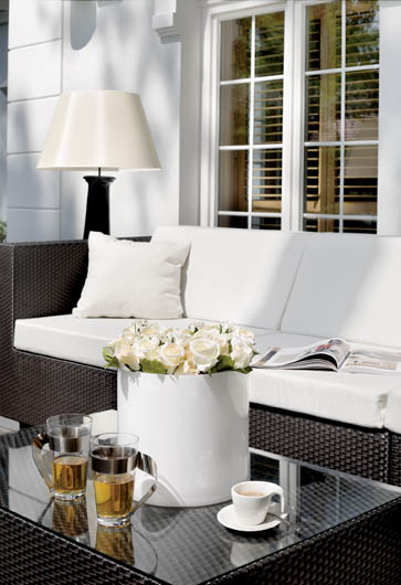 • W salonie pod chmurką elegankie meble wyplatane z przypominającego rattan tworzywa loom, które jest odporne na każdą pogodę.