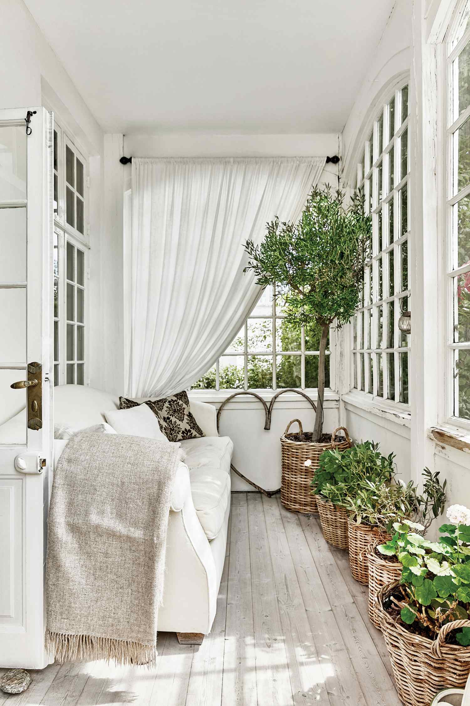 WERANDA OD FRONTU DOMU TO IDEALNE MIEJSCE DO ODPOCZYNKU. STOJĄ TU JASNA KANAPA I OCZYWIŚCIE ROŚLINY – DUŻE DRZEWKO OLIWNE ORAZ PRZYNIESIONE Z OGRODU KWIATY.