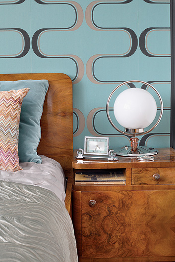 • Meble z epoki i umiejętnie dobrane dodatki - tapeta Harlequina virtue. Poduszki wzorzyste Missoni, narzuta NAP, lampa nocna