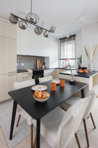 • Jasne obicia kanapy i krzeseł. Apartament w kamienicy na Powiślu
