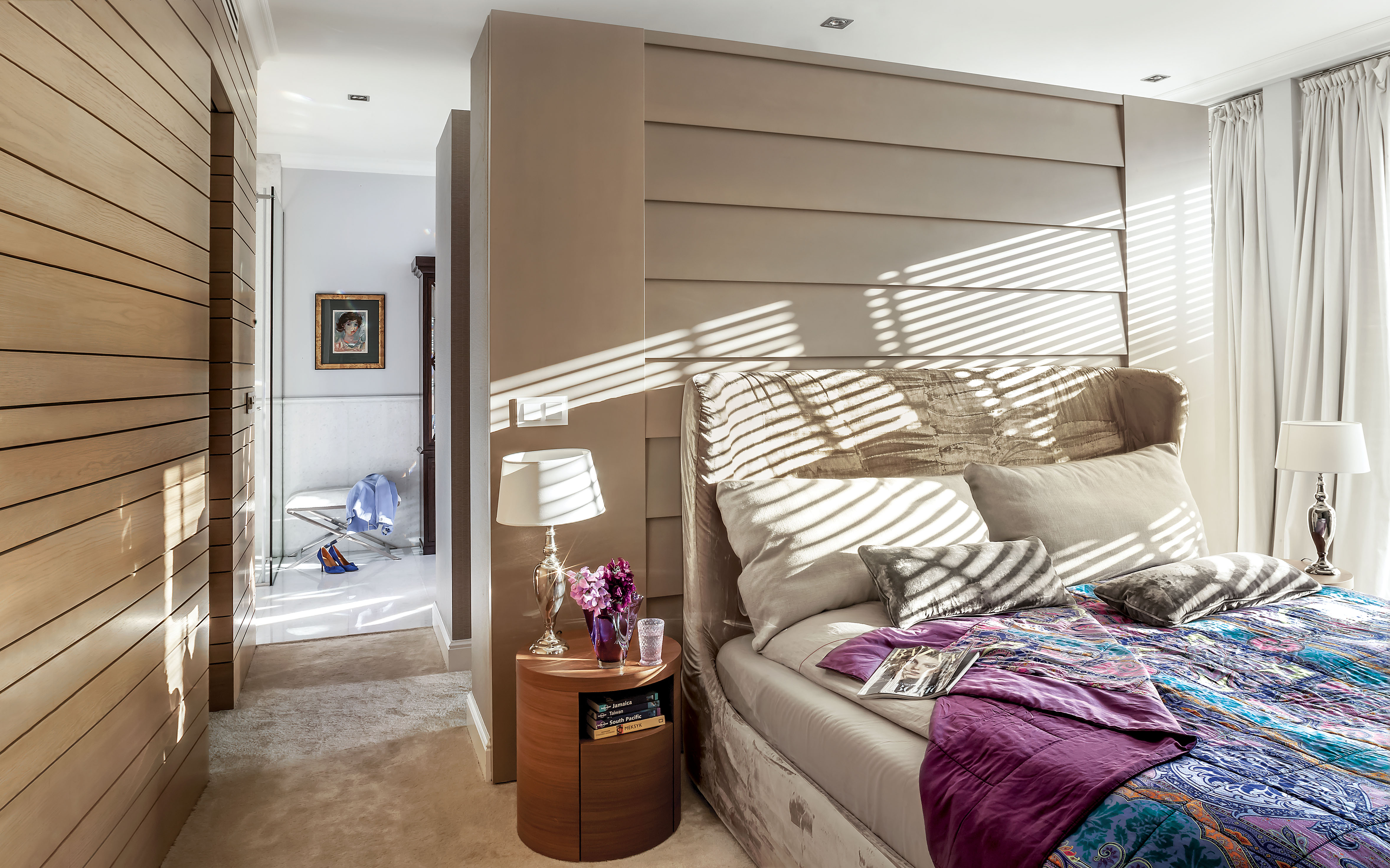 Sypialnia z łóżkiem od Meridiani. Za plecami - garderoba i łazienka; wszystkie trzy pomieszcenia mają naturalne ciepłe światło.