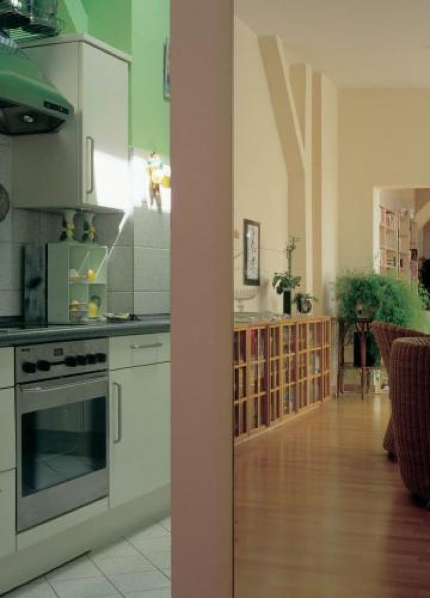 Czasem mniej znaczy więcej. Tak właśnie jest w tym mieszkaniu na strychu kamienicy. Główną ozdobą salonu są kolorowe zasłony z surowego jedwabiu. Kiedy prześwieca przez nie słońce, pokój tonie w ciepłych barwach. Plecione fotele w tym samym jasnym kolorze co podłoga, stół ze szklanym blatem i niska biblioteczka są tu tylko „dodatkiem” do świetlistej aury.   W kuchni wrażenie świeżości i przestrzeni dają proste bi