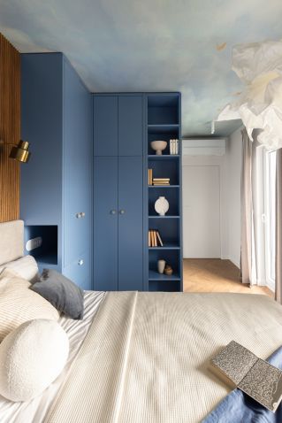 • aranżacja małej sypialni z półkami nad łóżkiem