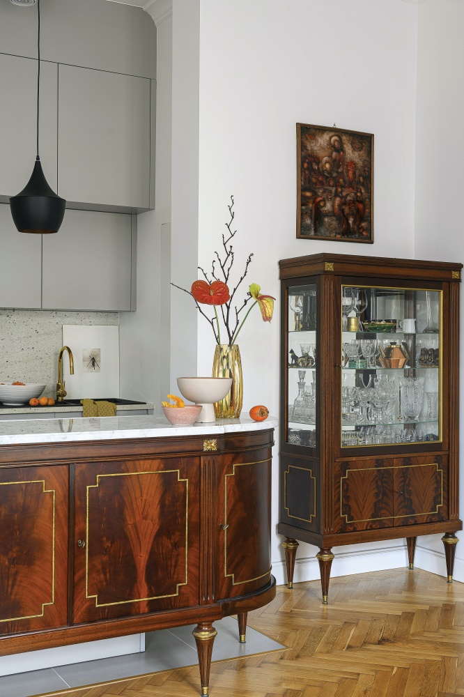 Stylowe meble obok nowoczesnych, oryginalna wyspa kuchenna i dzieła sztuki – mieszkanie w kamienicy na Mokotowie