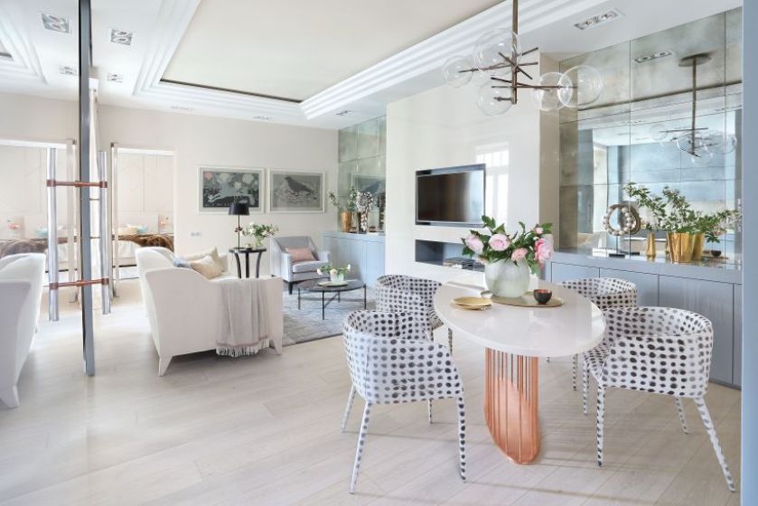 • salon urządzony stylowymi meblami i nowoczesną sztuką