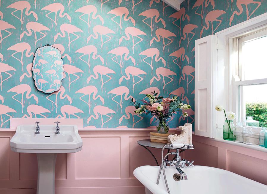 Najmodniejsze tapety mają brodę – czerpią inspirację ze starych zielników, plakatów ze złotej ery jazzu, deseni retro i obrazów w stylu op-art.    PTAKI I PTASZKI    W tym sezonie największe oklaski zbierają ptaki, zwłaszcza dwa – papuga i flaming. Pierwsza wnosi dużo koloru, ten drugi – piękną linię. Jego profil z zakrzywionym dziobem, esowatą szyją i uniesioną nogą jest po prostu bardzo dekoracyjny. Wygląda wręcz jak stylizowany zn