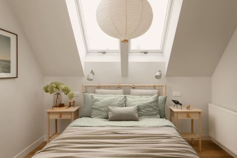 Mieszkanie pod skosami w pastelowych kolorach – jak ciekawie połączyć nowoczesność i retro z akcentami designu na 46 metrach