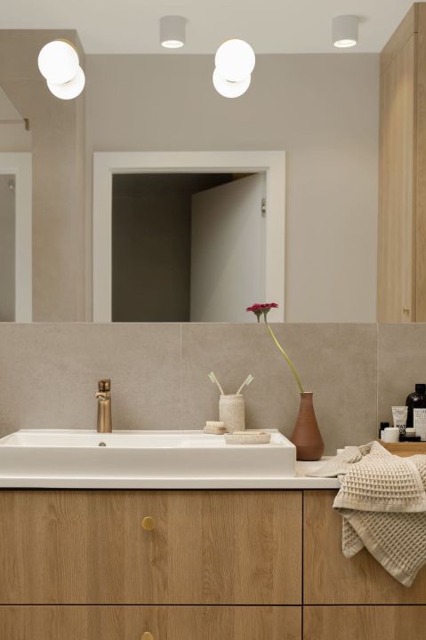 Mieszkanie na poddaszu w drewnie, beżu i szarościach – 52 metry kwadratowe pod skosami urządzone w stylu skandynawskim