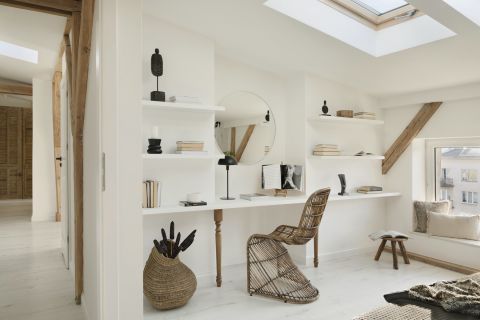 Mieszkanie na poddaszu w drewnie, beżu i szarościach – 52 metry kwadratowe pod skosami urządzone w stylu skandynawskim
