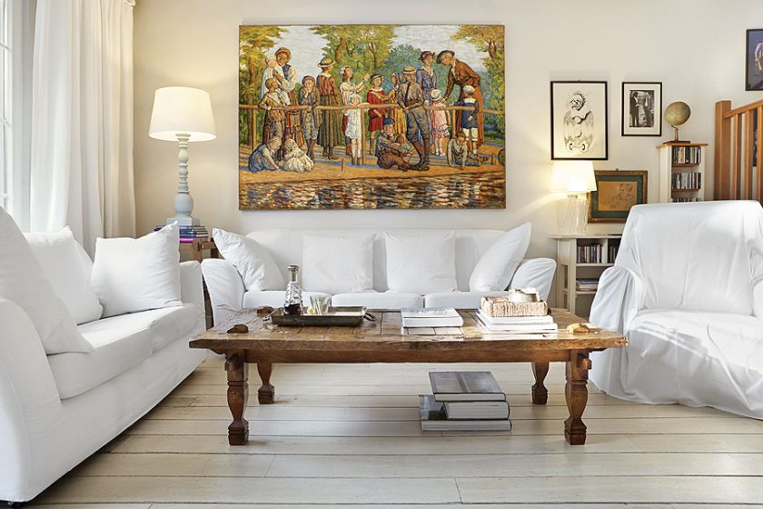 • Salon w bieli. Zamiast marmuru wokół kominka cegła i drewniane decha pomalowana na biało.