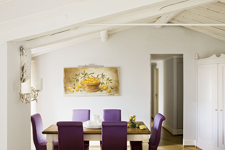 Słabość gospodyni do fioletu widać w tym domu na każdym kroku. Tu stoją lawendowe krzesła.