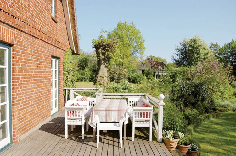 Z drewnianego tarasu schodzi się wprost do ogrodu - dumy właścicieli.